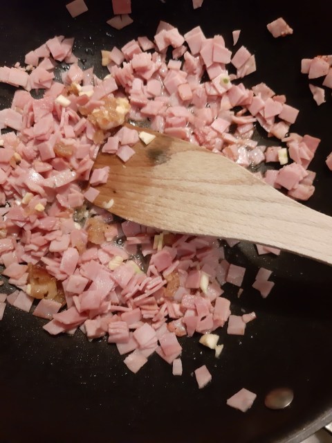 - Малко преди да е готова шунката, добавих чесъна, нарязан на ситно. Него пържа много кратко, защото бързо изгаря.