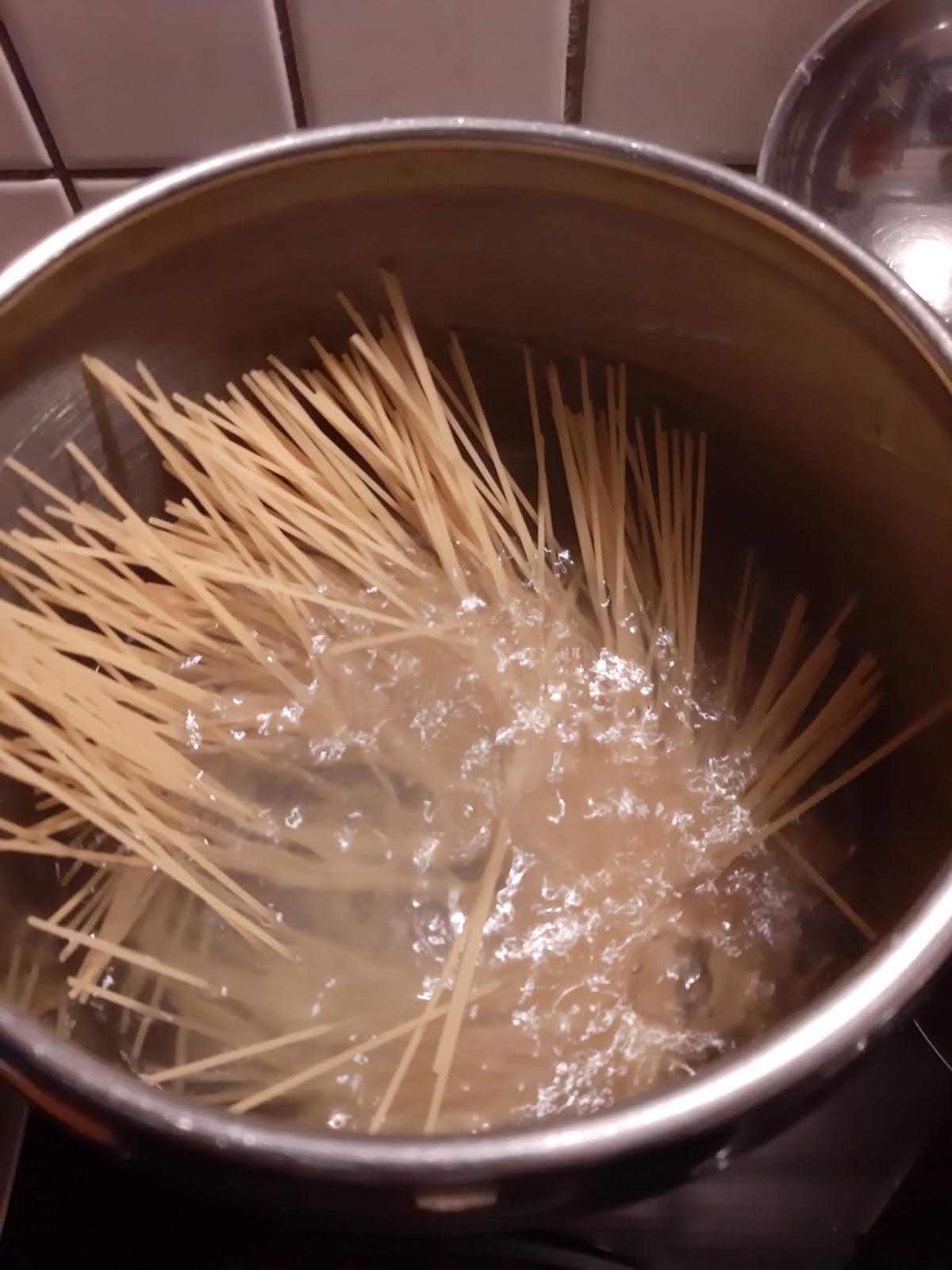 - Започвам със сваряването на спагетите в подсолена вода. Хубаво да спазите указанията на опаковката, но може да ги варите 1 – 2 минути по-малко, за да са ал денте. И без това ще се дообработват след това.