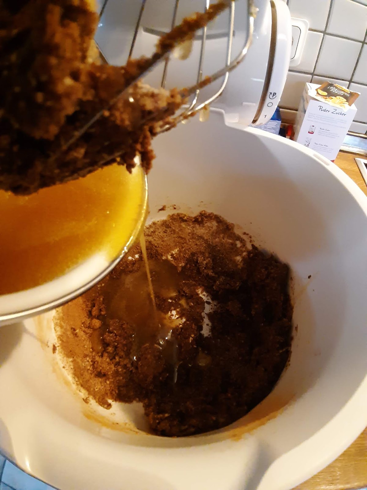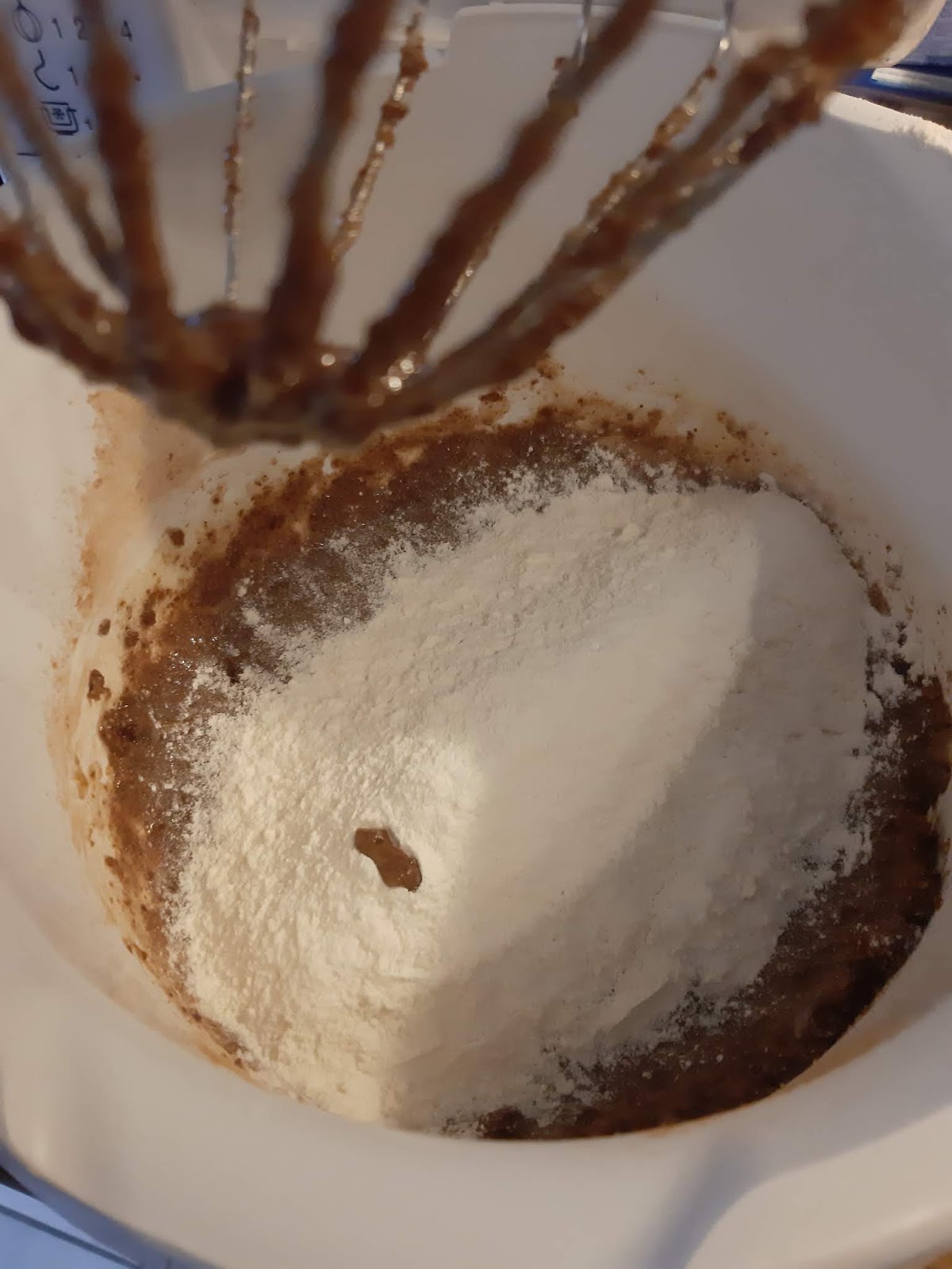 - Добавям сухата смес към останалите съставки като редувам с добавянето на ром.