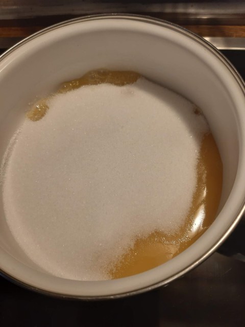 - Загрявам на ниска температура, като бъркам от време на време или докато захарта се разтопи.