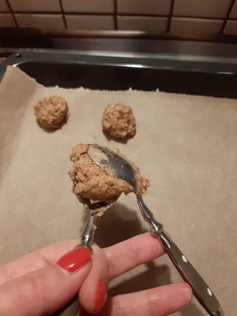 - Готовите топчета подредих в тава с хартия за печене, като оставих достатъчно разстояние между тях.