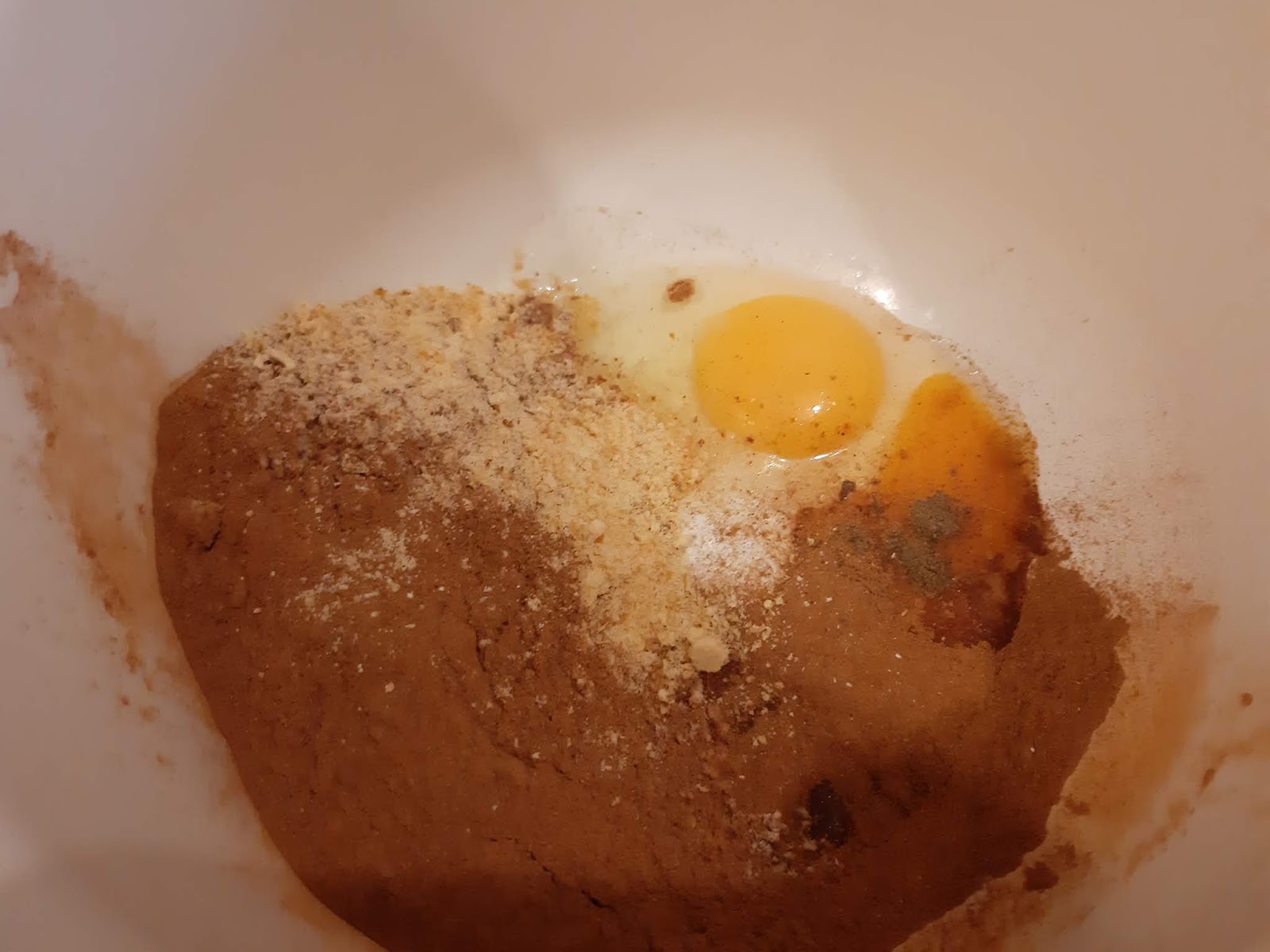 - Разделям едното яйце на белтък и жълтък. Белтъка прибирам в хладилник, а жълтъка сипвам в купата на миксера, заедно с едно цяло яйце, смлените бадеми, подправката спекулатиус, кората от лимона, едро счуканите бадеми.