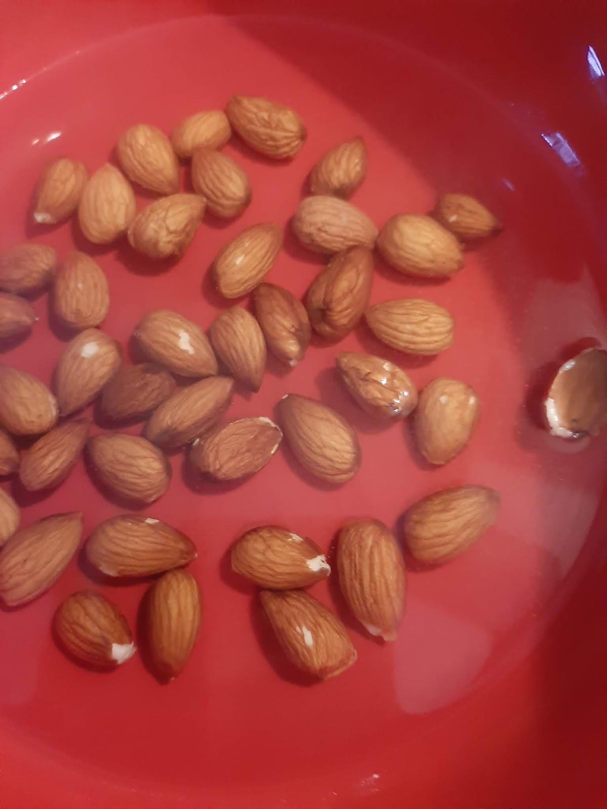 - За декорацията имах бадеми с люспи. За целта ги накиснах с гореща вода и после лесно обелих.