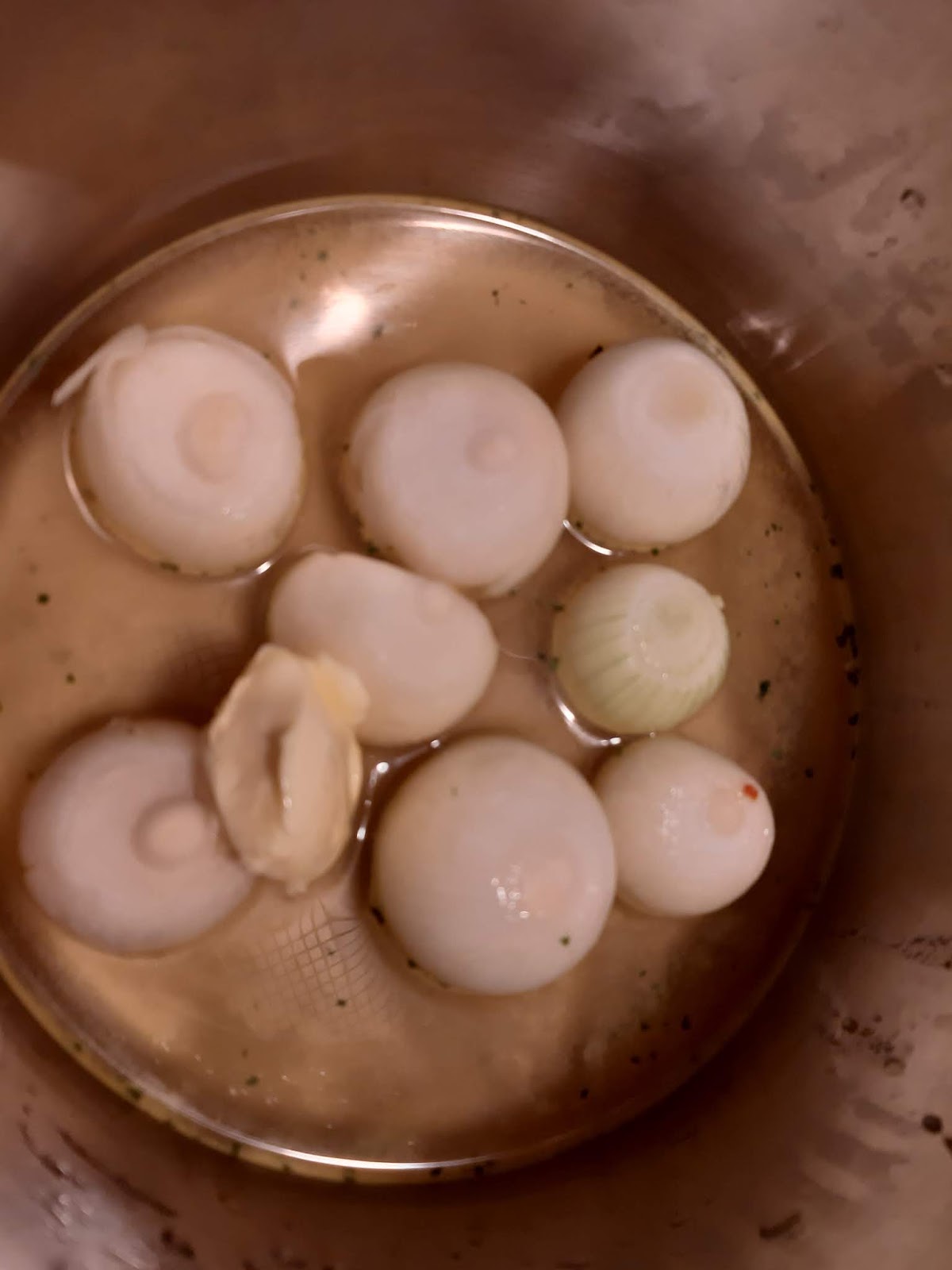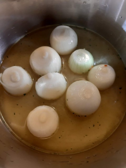 - Подреждам лукчетата на дъното на тенджерата и сипвам толкова бульон, че да им стигне само до половината.