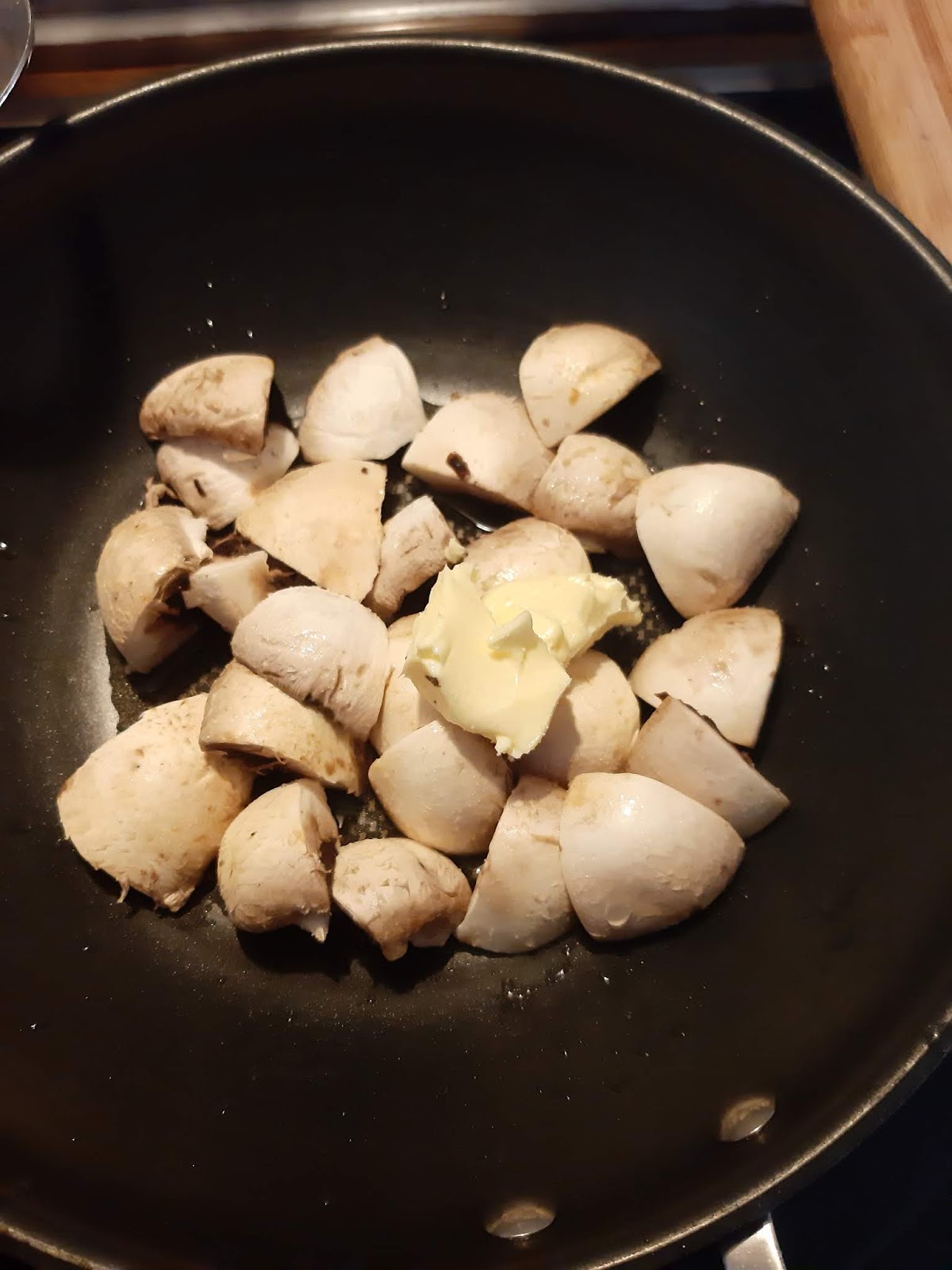 - Сипвам само на дъното на тигана малко вода, добавям гъбите, поръсвам с 1 с. л. лимонов сок, поръсвам със сол и добавям 1 с. л. масло