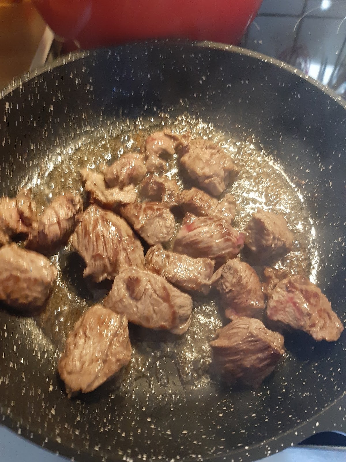 - Запържвам кубчетата месо от всички страни, за да се зачервят.