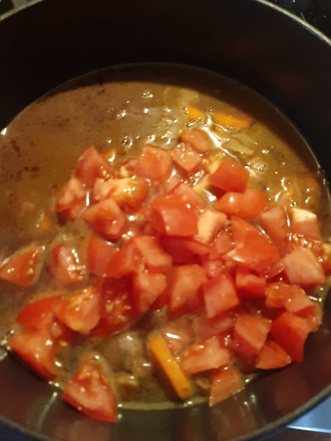- Нарязвам доматите на маки кубчета и ги добавям към ястието.