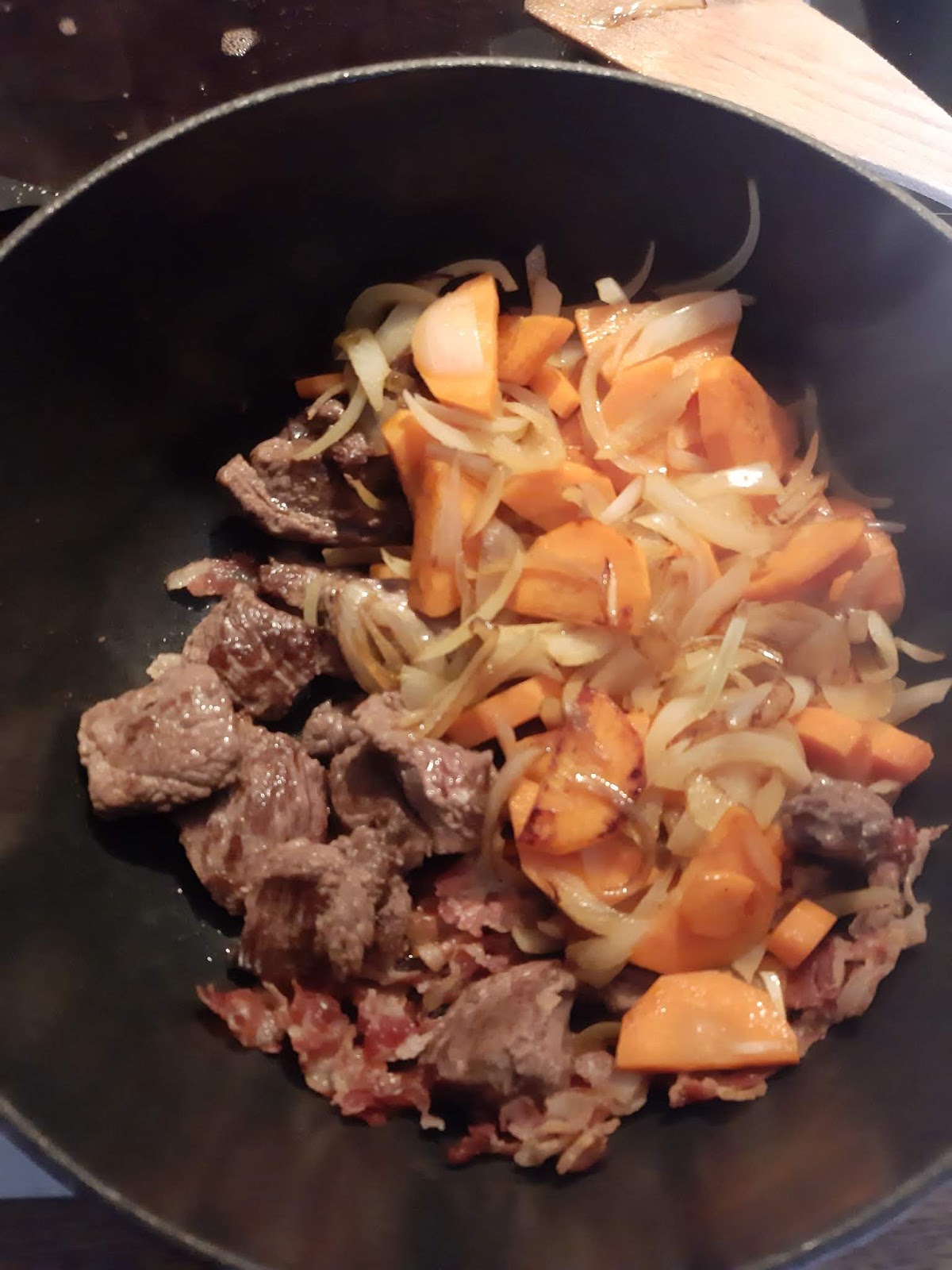 - В останалата от пърженето на месото мазнина запържвам до златисто нарязания на ленти лук и на филийки моркови.