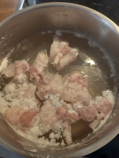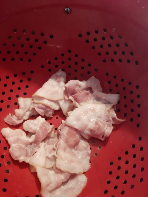 - За да получа вкусен сос е нужно първо да бланширам бекона. Това се прави, за да се отстрани аромата на пушено, както и соления вкус. За целта е нужно да пусна филийките бекон в 2 литра студена вода и след като заври, оставям да къкри на слаб огън за 8 минути.