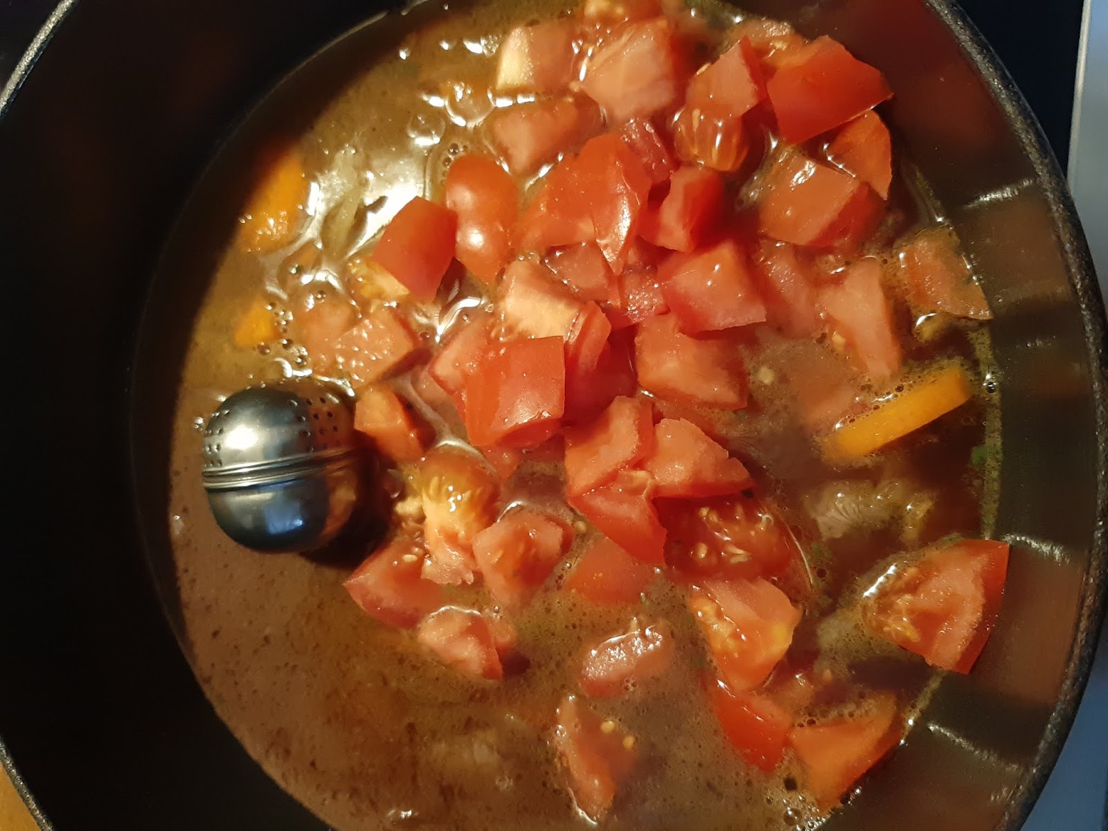- Щом ястието заври, покривам с капака и оставям да къкри на много бавен огън на котлона.