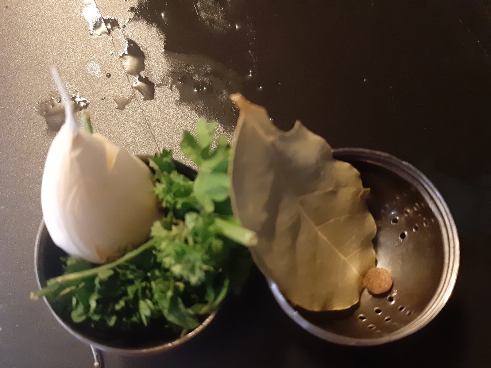 - Всички подправки слагам в моята метална кошничка за подправки. Ако нямате такава, просто ги увивате в тензухена кърпа.