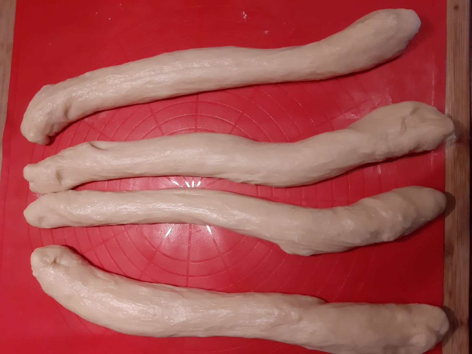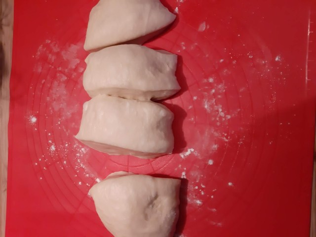 - Втасалото тесто разделих на четири равни части.