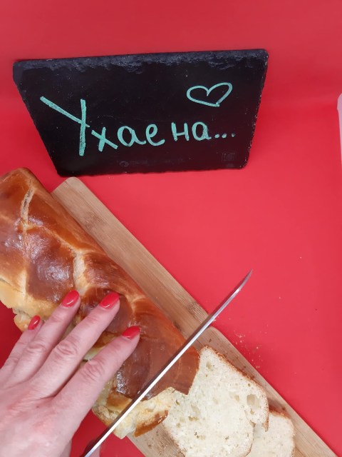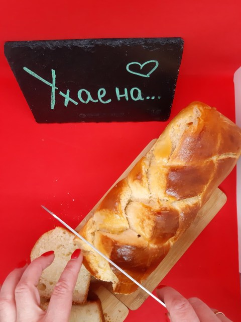 - Готовото хлебче охладих напълно, преди да нарежа.