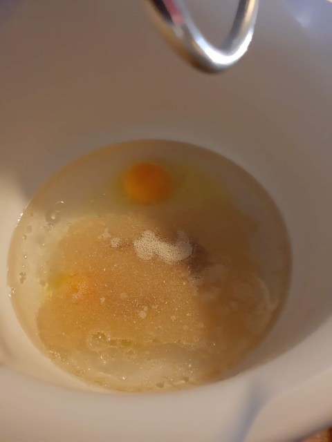 - Добавям две от яйцата, олиото и започвам да бъркам с миксера на ниска степен.