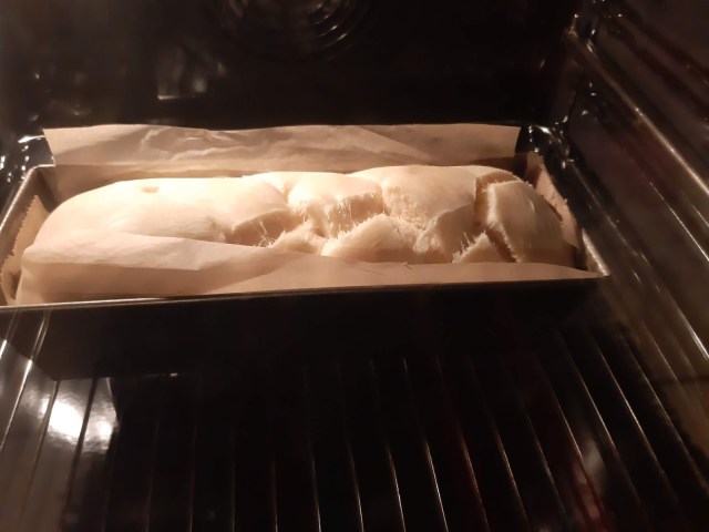- Когато прецених, че хлебчето е достатъчно напълнило формата загрях фурната до 180 градуса и без вентилатор. При тесто с мая избягвам да включвам вентилатор.
