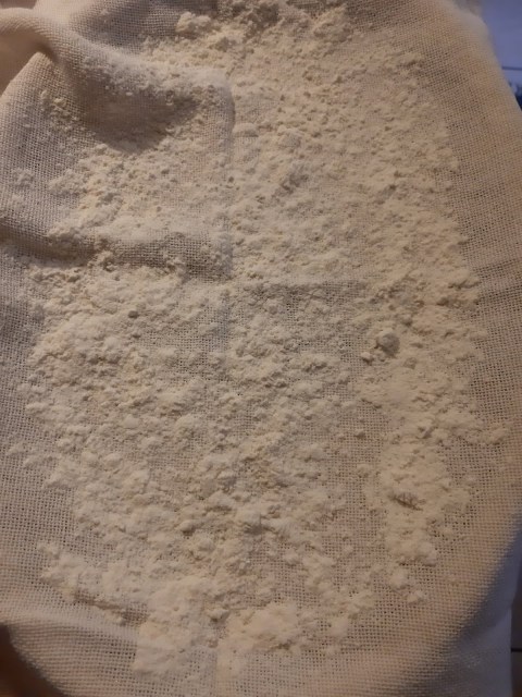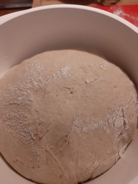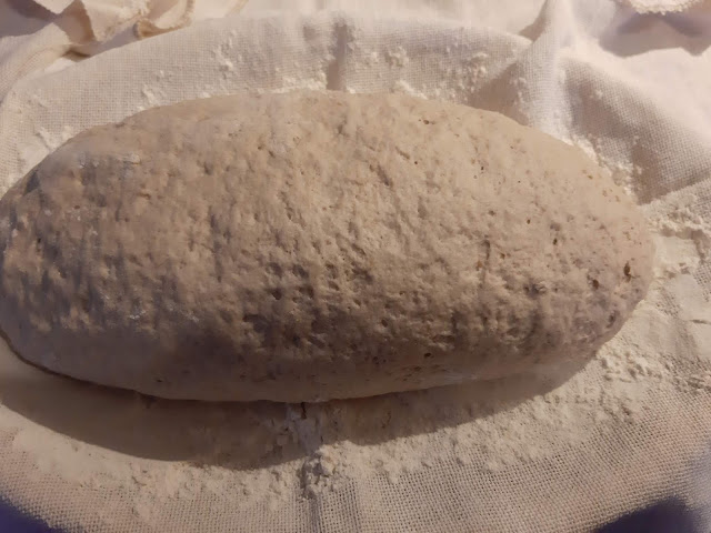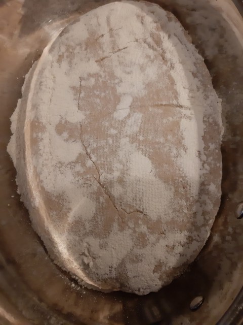 - Поради липса на кошница за втасване на голям продълговат хляб, постилам кърпа в дълбока продълговата чиния или купа и поръсвам обилно с брашно.