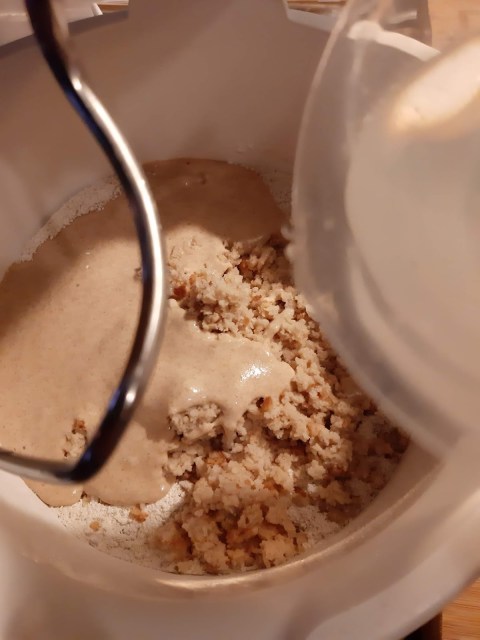 - Изсипвам трохичките в купата на миксера и заливам със 100 гр вода.