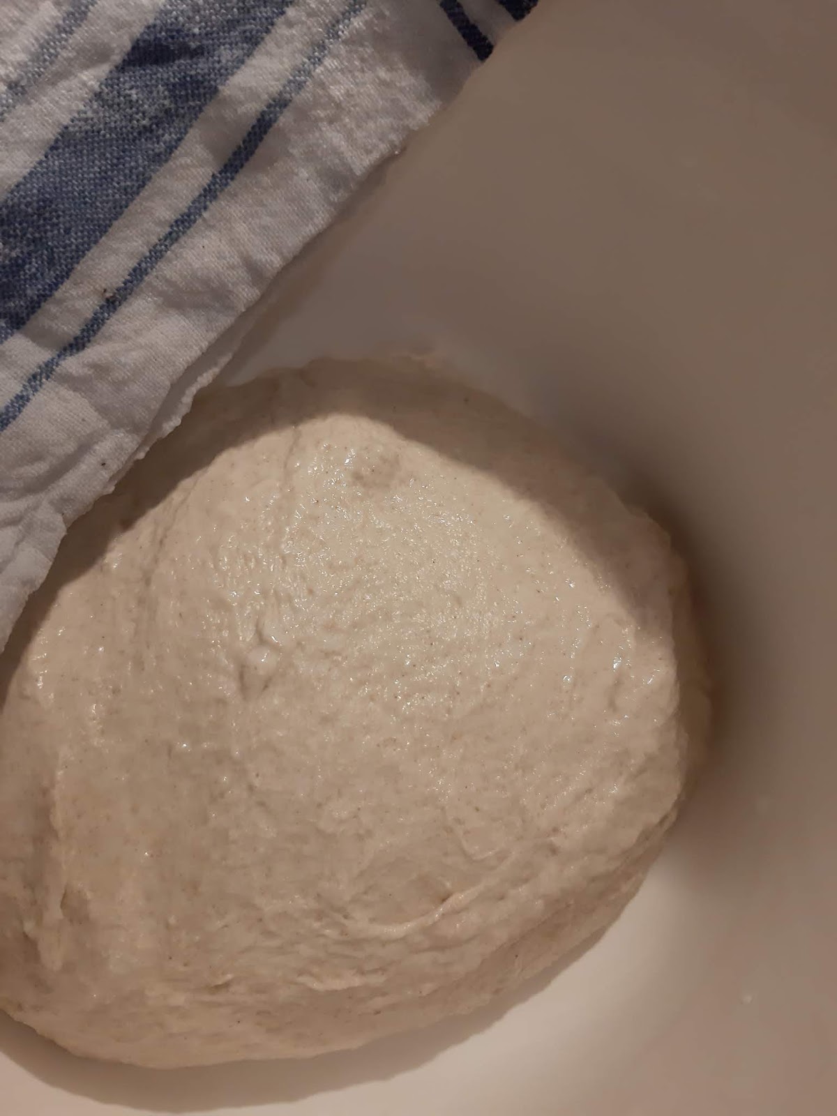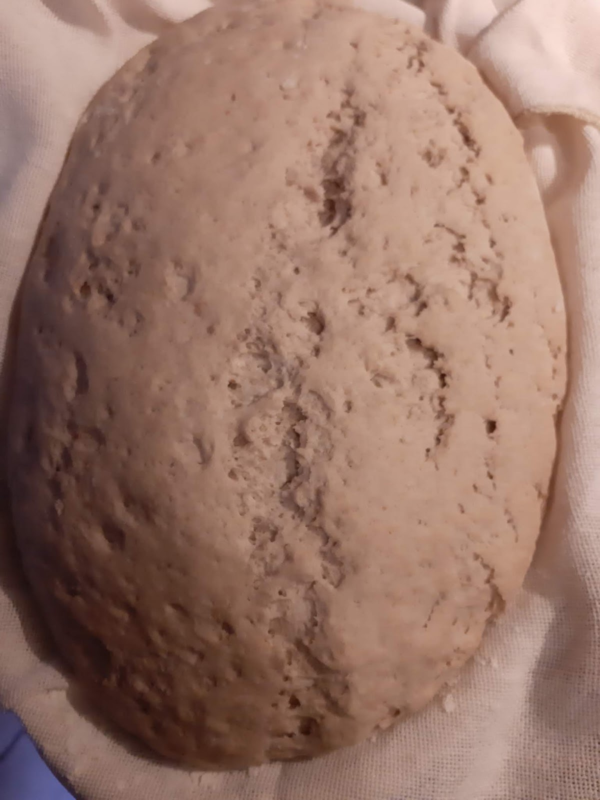 - Поради липса на кошница за втасване на голям продълговат хляб, постилам кърпа в дълбока продълговата чиния или купа и поръсвам обилно с брашно.