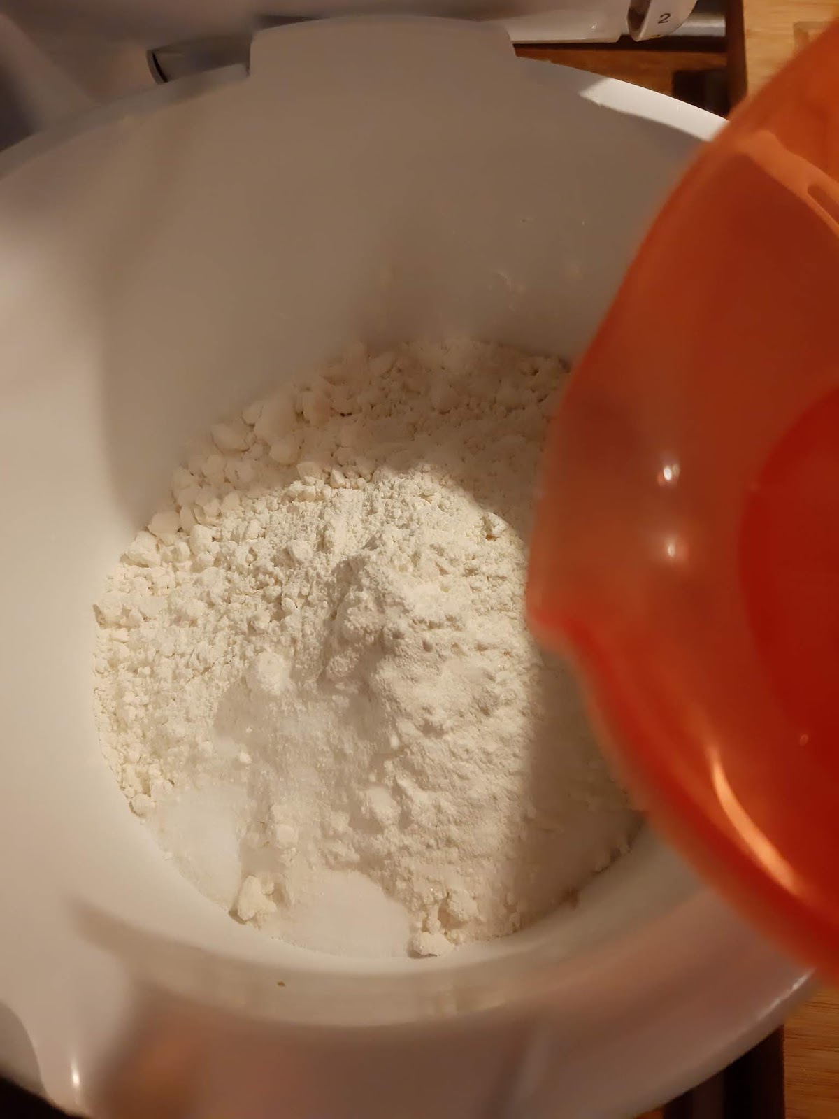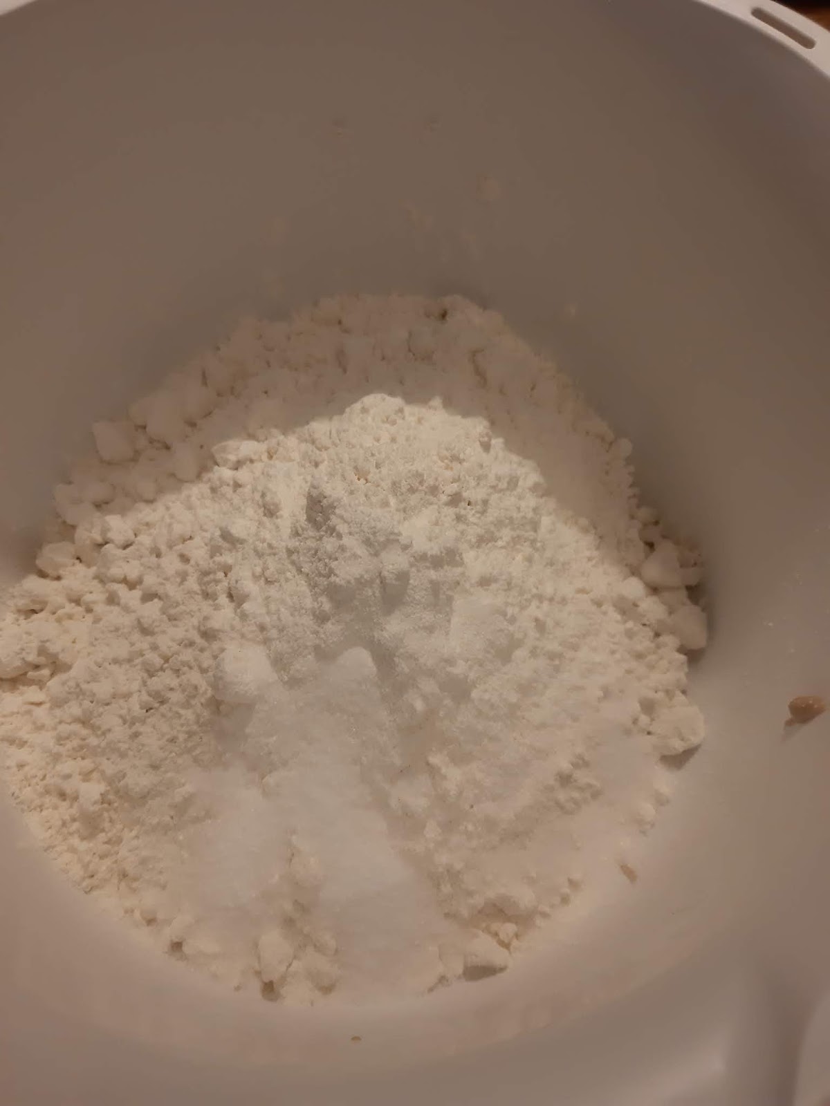 - Добавям двата вида брашно и солта.