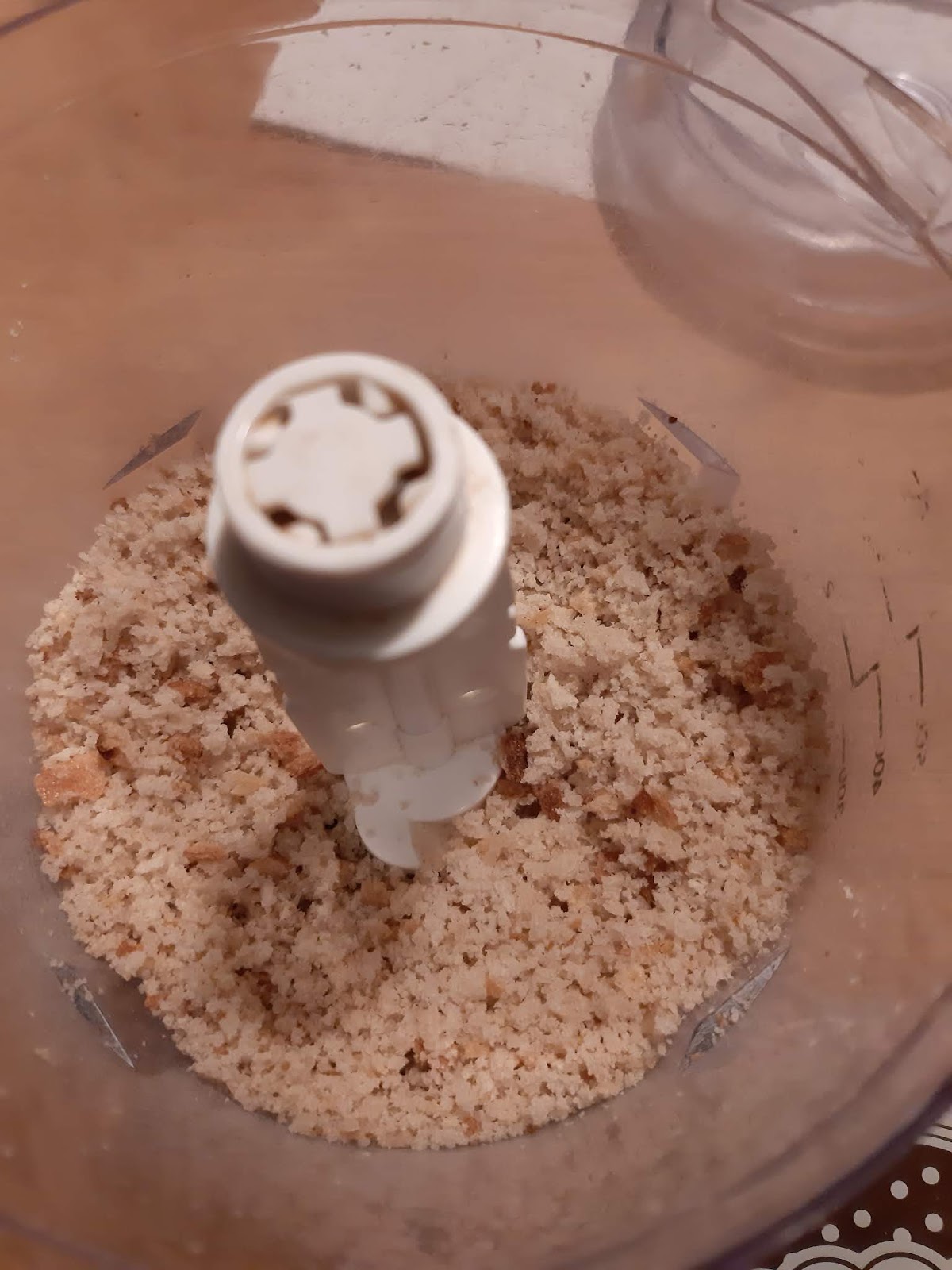 - Изсипвам трохичките в купата на миксера и заливам със 100 гр вода.