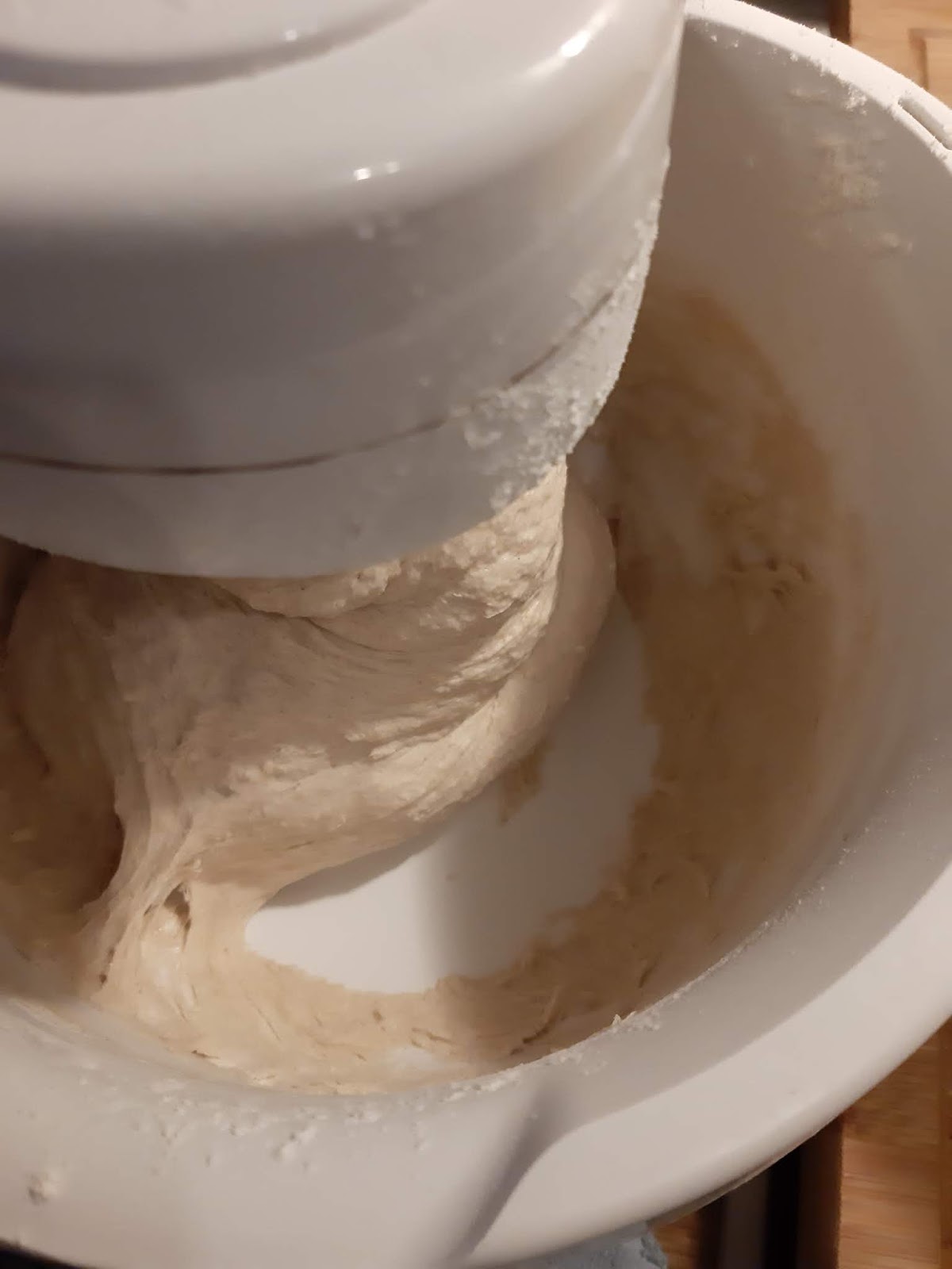 - Меся почти 10 минути или докато започне тестото да се отлепя от стените на съда. Ако случайно е много рядко и лепкаво тестото, добавям още малко брашно или докато тестото стане жилаво и нелепнещо.