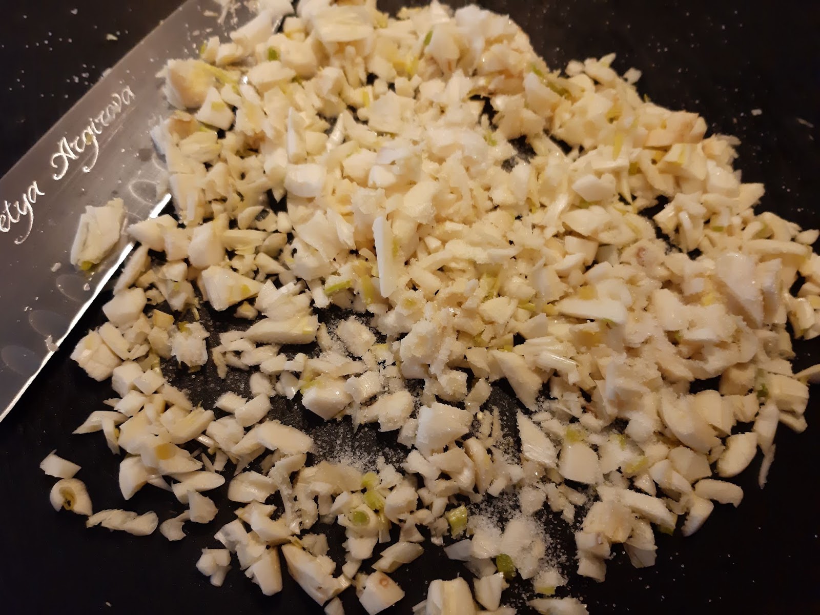 - Ако имате преса за чесън – използвайте я. Аз нямам. Внушила съм си, че като пасирам чесъна по този начин, той си губи вкусовете. Затова нарязвам на ситно, поръсвам с малко сол, изчаквам и отново притискам с ножа.