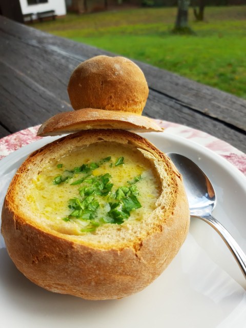 За чесновата супичка чух от Евгения Анева и нейната майка. Те споделиха в групата Обичам да готвя, че в Прага чесновата супа се сервира в хлебни панички.