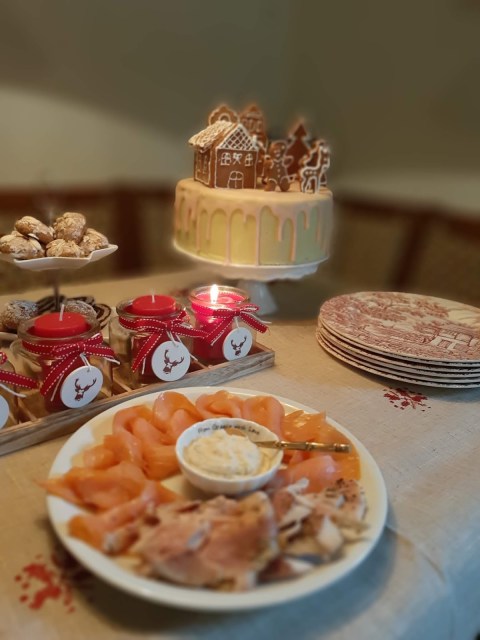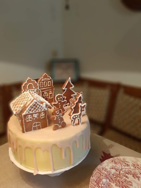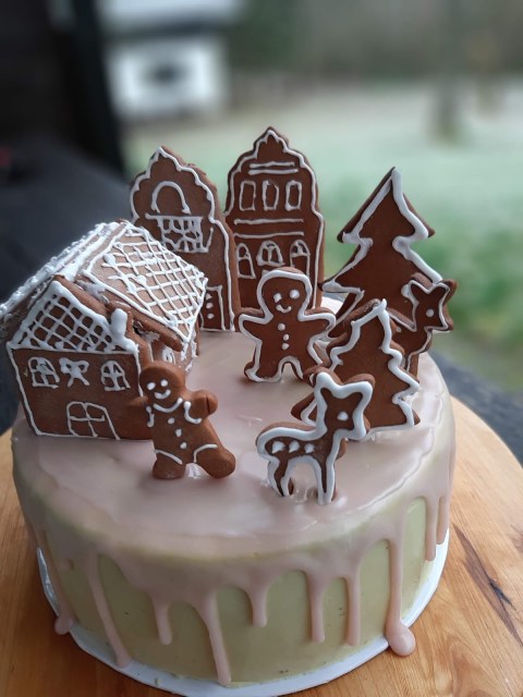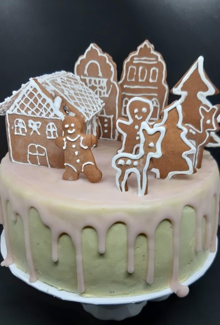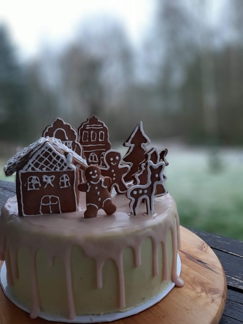 В тази Коледна торта имаме съчетани меденки – лебкухен /те са в декорацията/ с един немски блат за торта, който носи същото име – лебкухен и има в себе си и мед, и подправката за лебкухен. Кремът между блатовете е наравен от греяно вино – глювайн, съчетано с портокалов сок, черешов компот и немски маслен крем. Тортата е измазана отвън с немски маслен крем, оцветен с малко матча и готова немска захарна глазура – розова и ароматна.