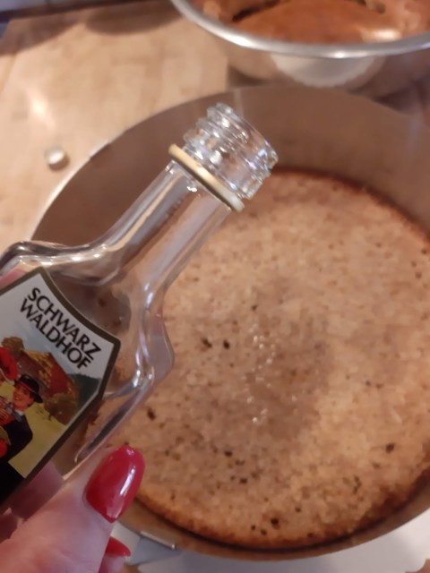 - Напоих всички блатове обилно с черешова ракия. Ако не намирате оригиналната черешова ракия от Шварцвалд можете да си поръчате ето тук.
