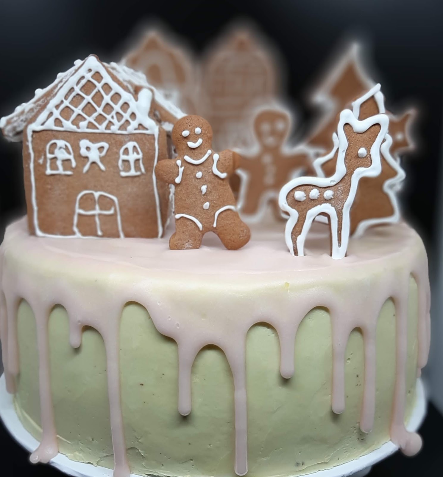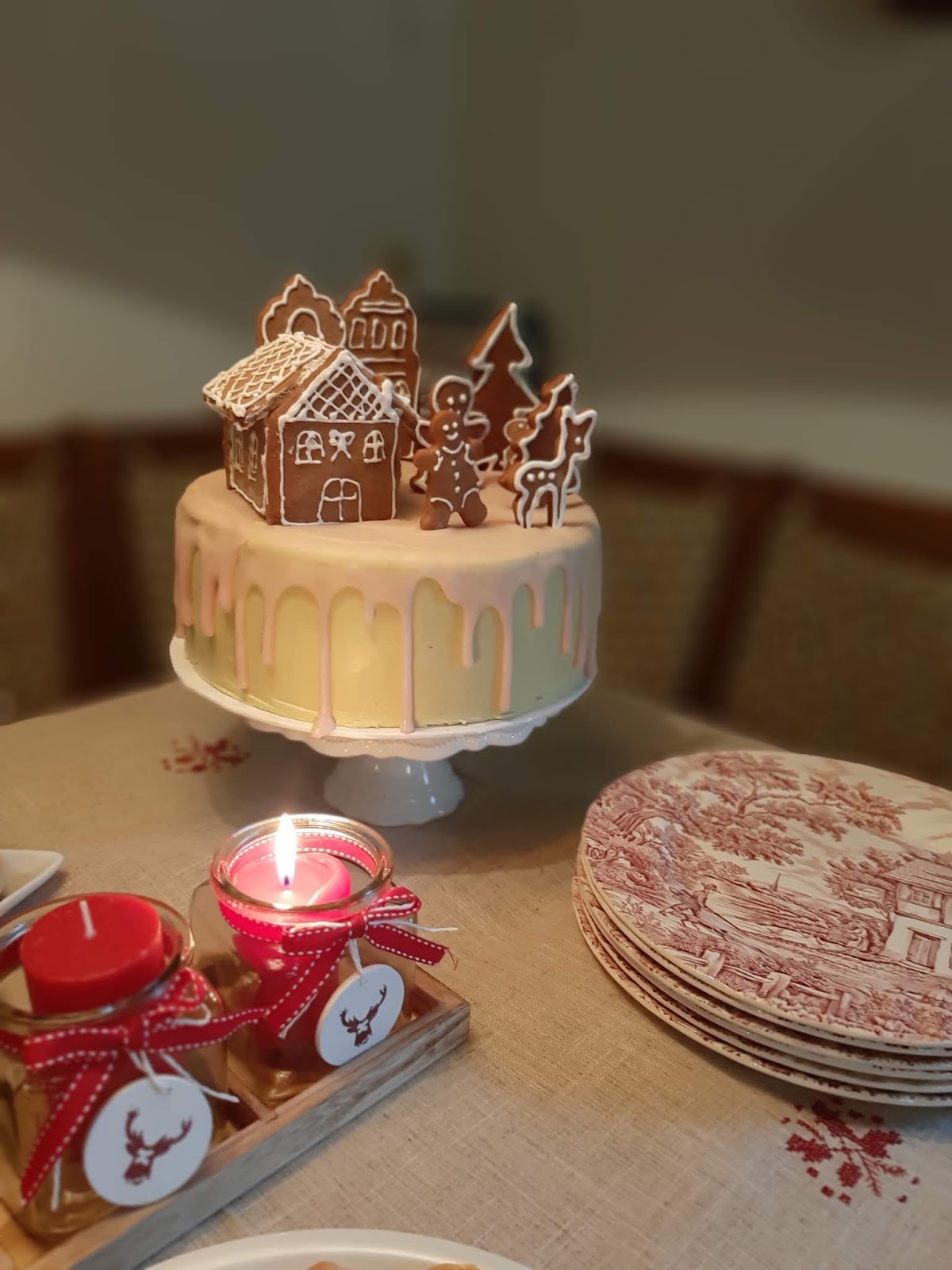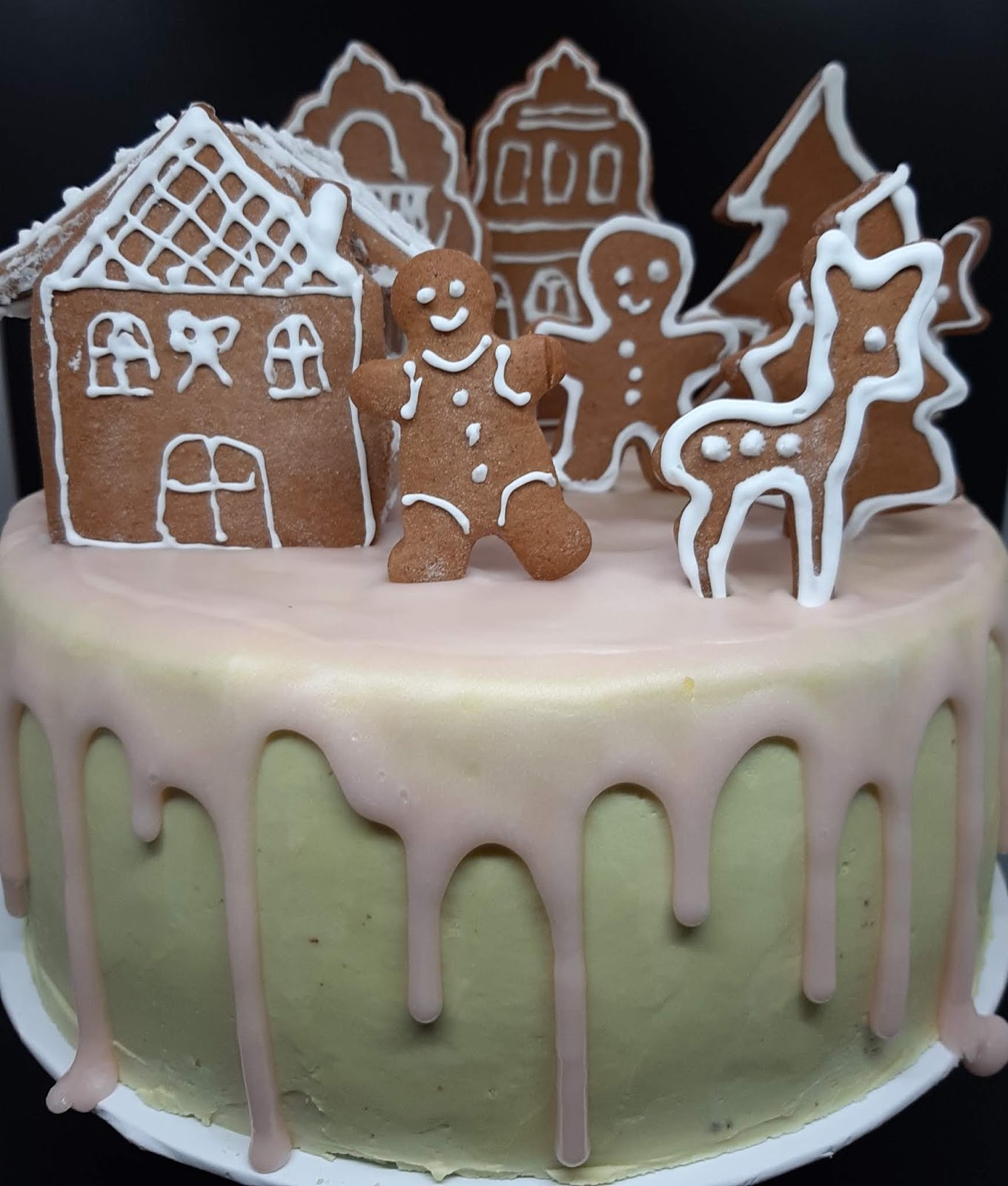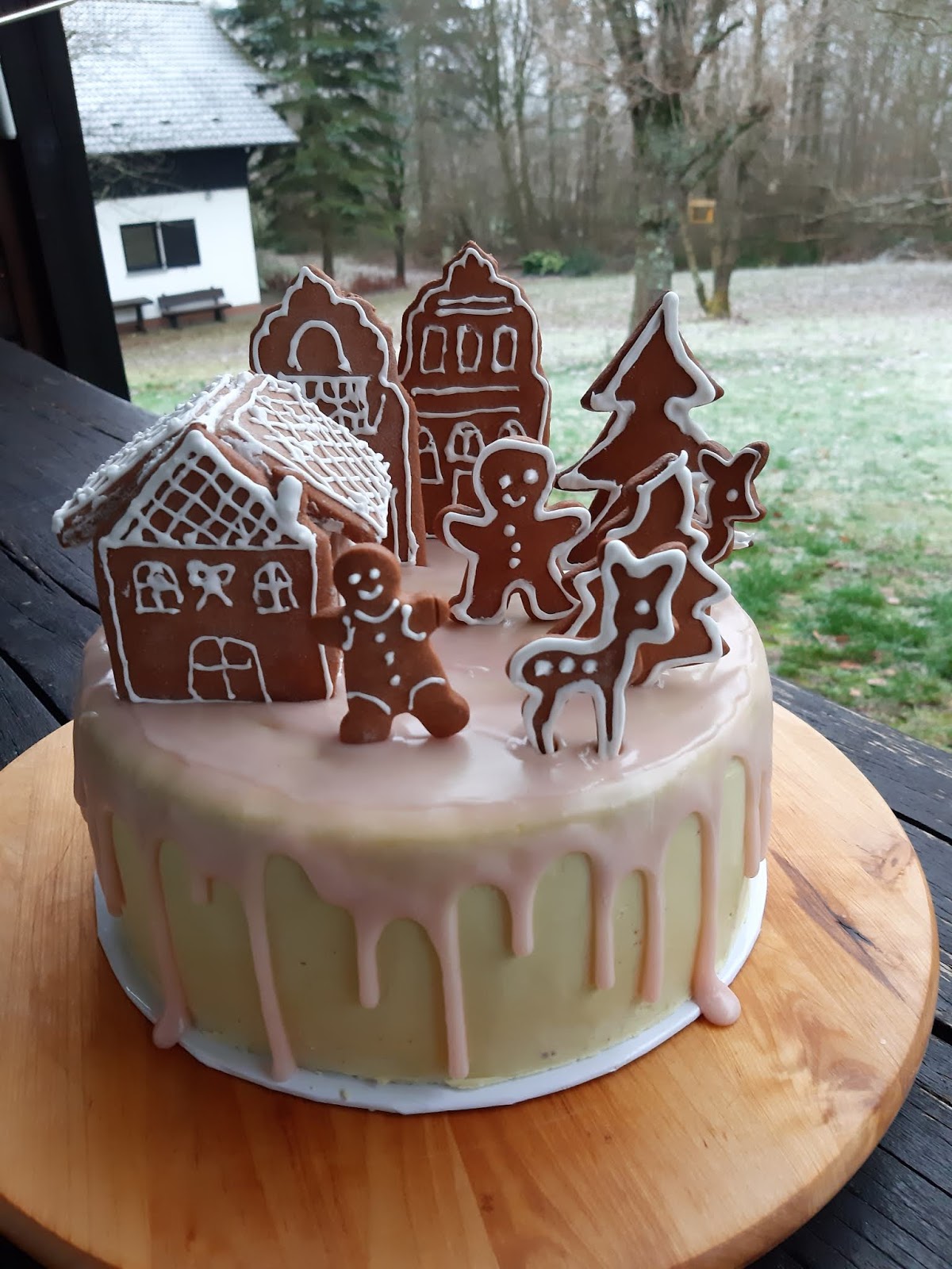 В тази Коледна торта имаме съчетани меденки – лебкухен /те са в декорацията/ с един немски блат за торта, който носи същото име – лебкухен и има в себе си и мед, и подправката за лебкухен. Кремът между блатовете е наравен от греяно вино – глювайн, съчетано с портокалов сок, черешов компот и немски маслен крем. Тортата е измазана отвън с немски маслен крем, оцветен с малко матча и готова немска захарна глазура – розова и ароматна.