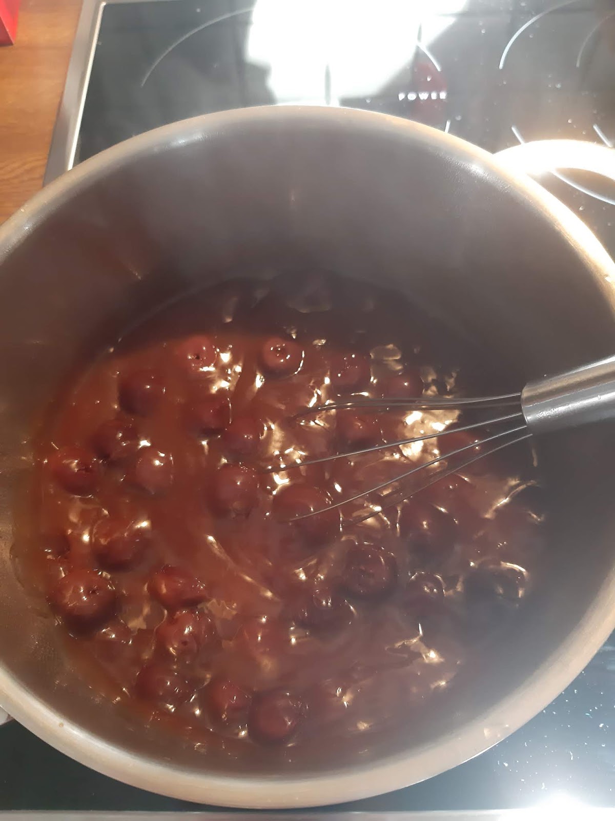 - Към едната част добавих лъжица по лъжица от черешовия пудинг, който е с греяно вино и портокалов сок.