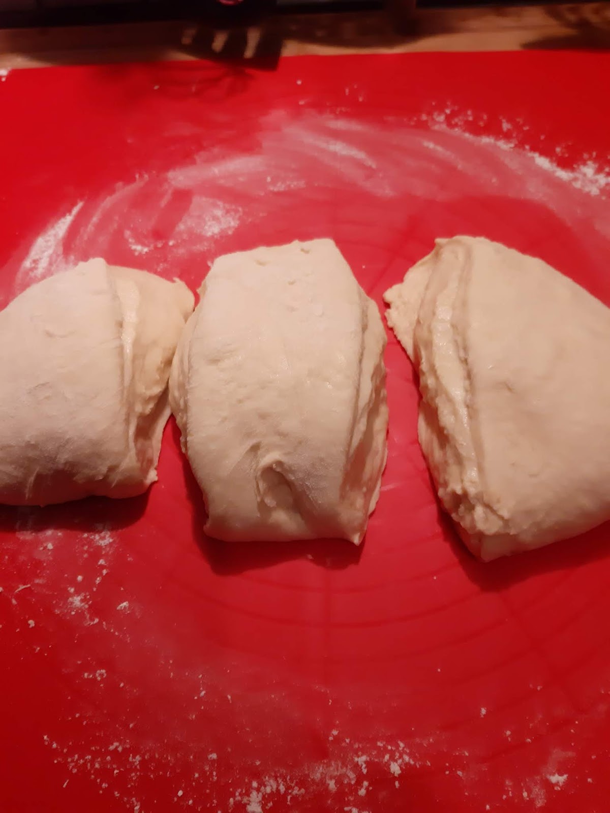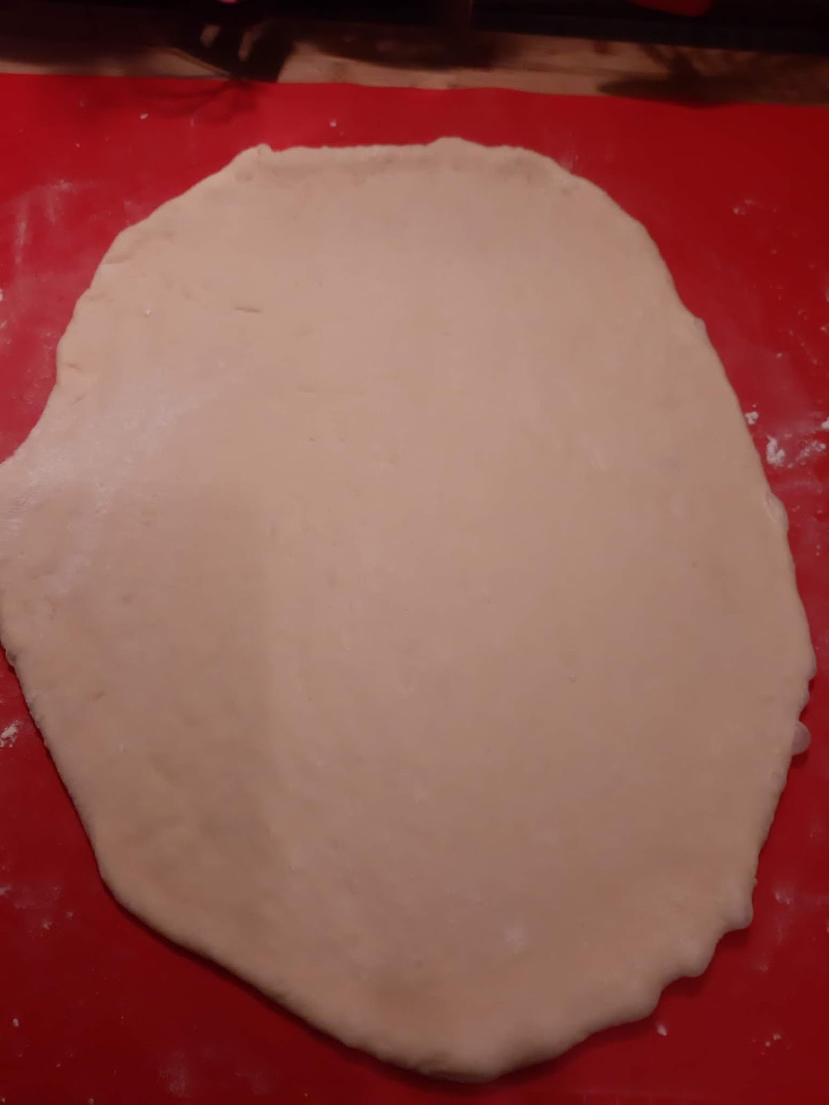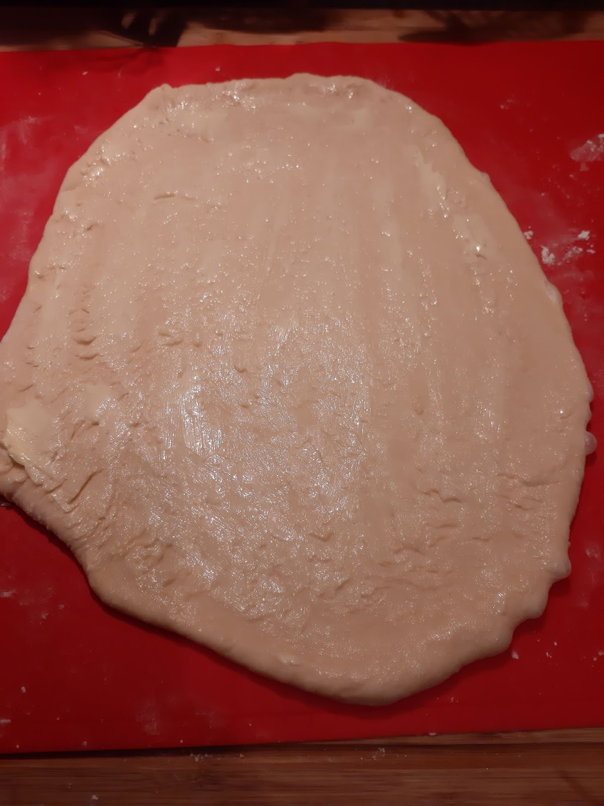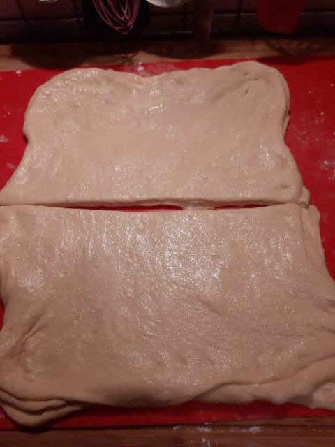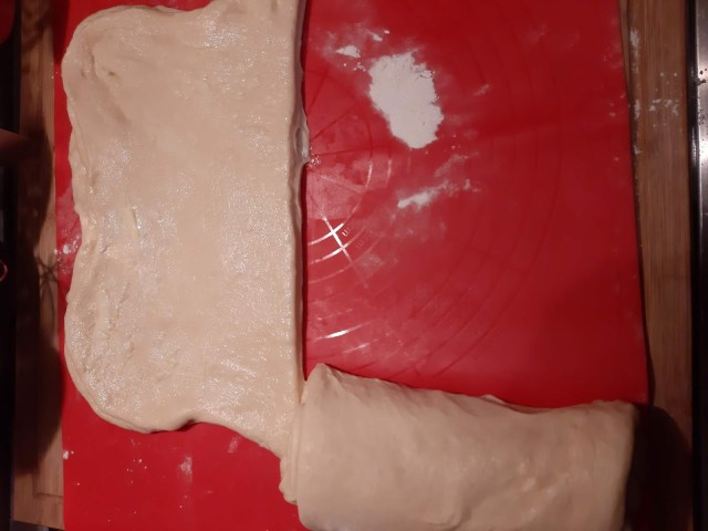 - Готовото тесто изсипах на набрашнена плоскост и доомесих на ръка.