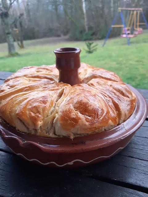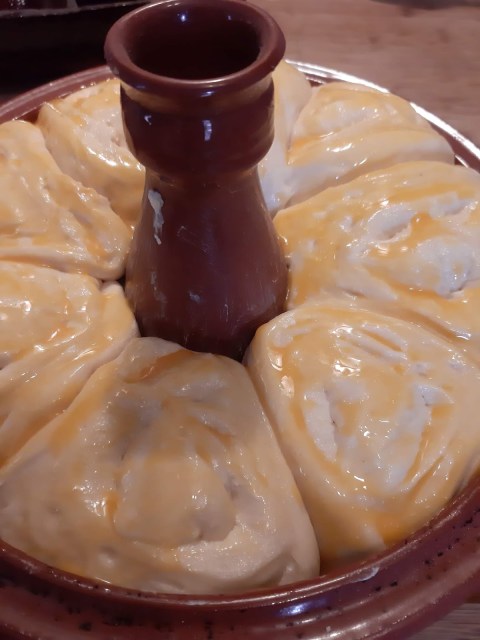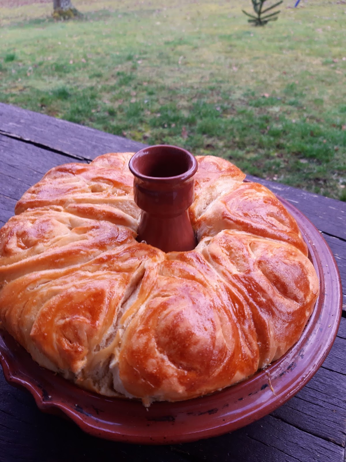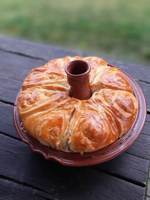 Аз изпекох погачата в този глинен съд, която е за бирено пиле или нанизано пиле.