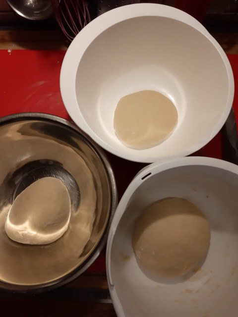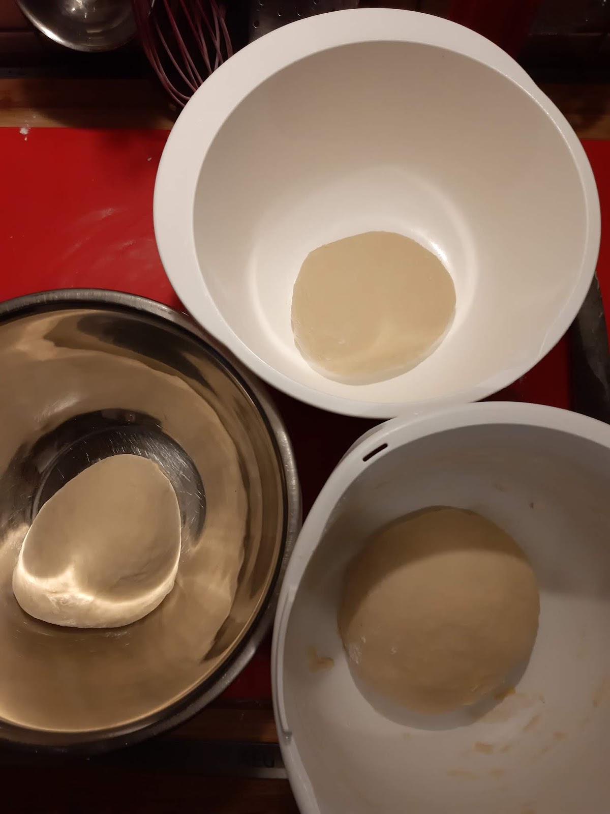 - Всяка част оформих на топка и сложих в отделни купи. Покрих купите с чиста кърпа и изчаках около 30 минути да увеличат двойно обема си.