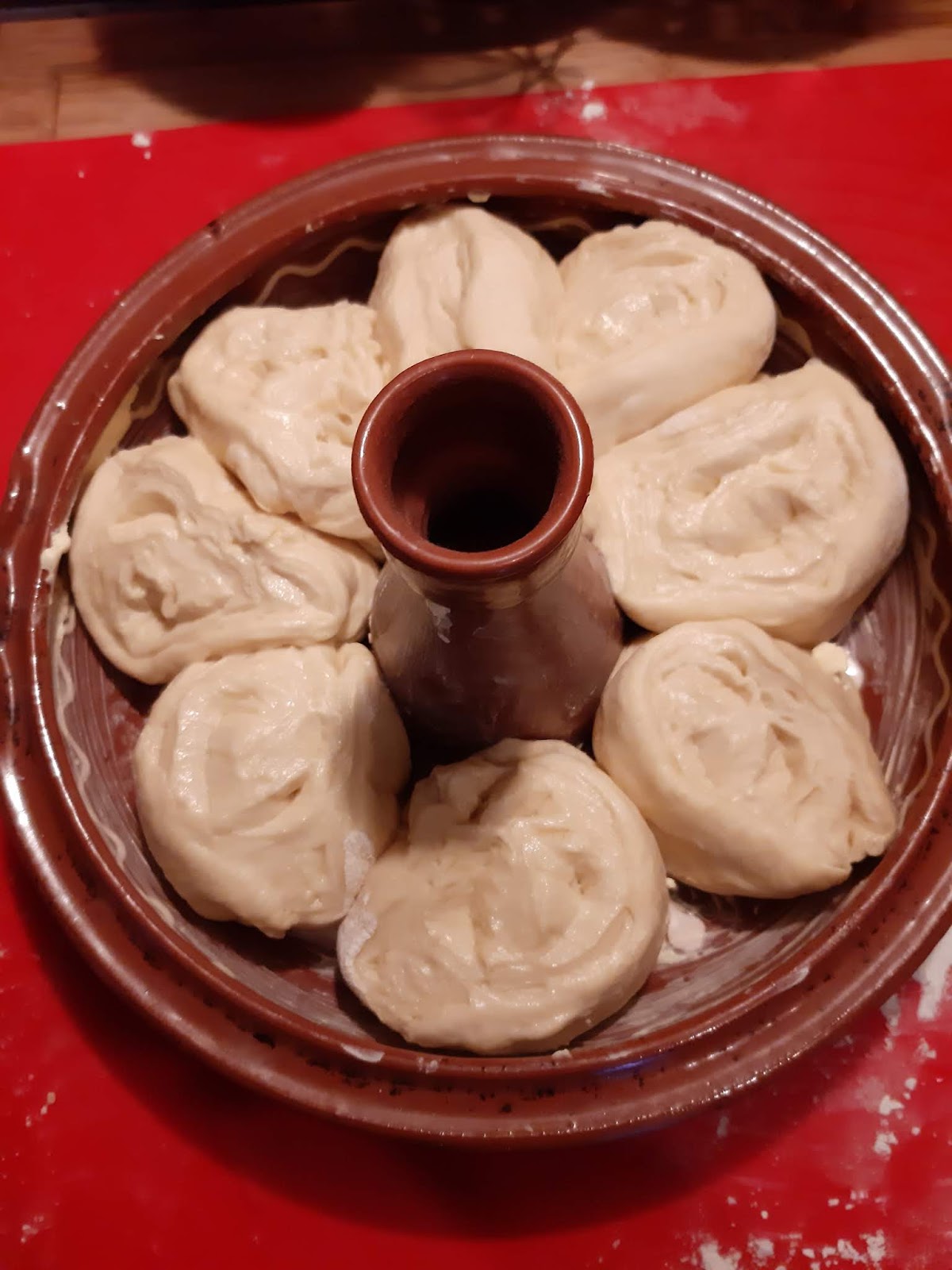 - Всяко руло нарязах на дебели 5 см. рула, които обърнах и поставих в намазана с маргарин форма за печене. В случая съд за пиле.
