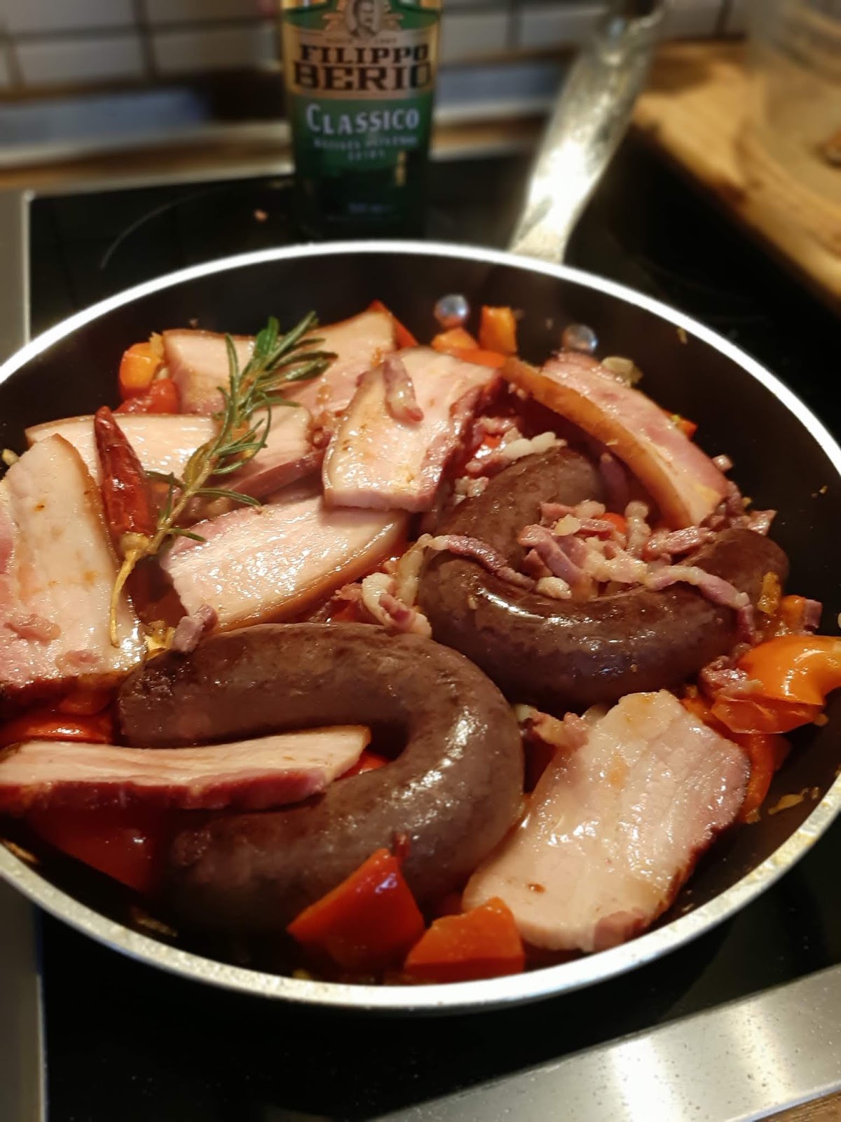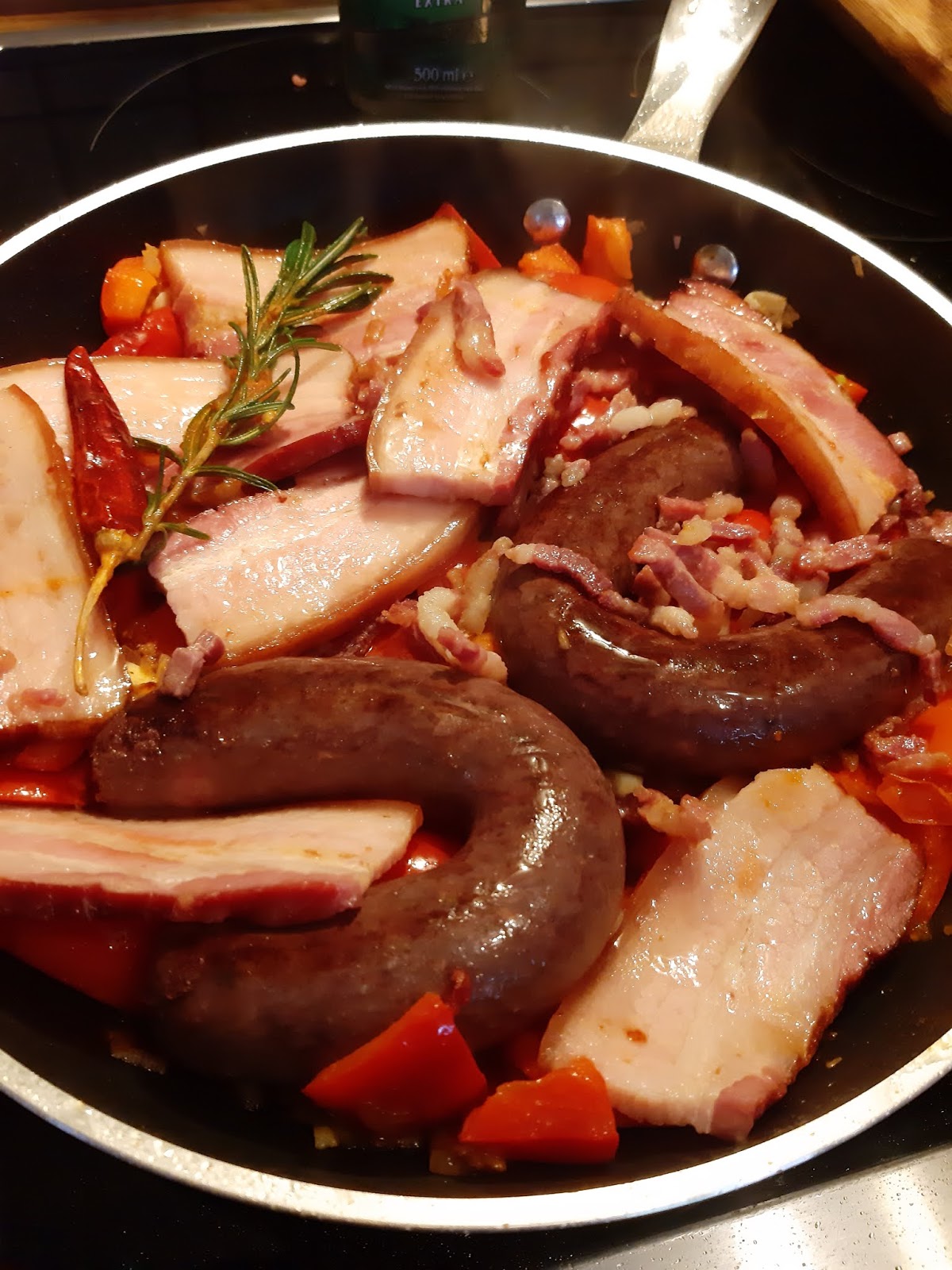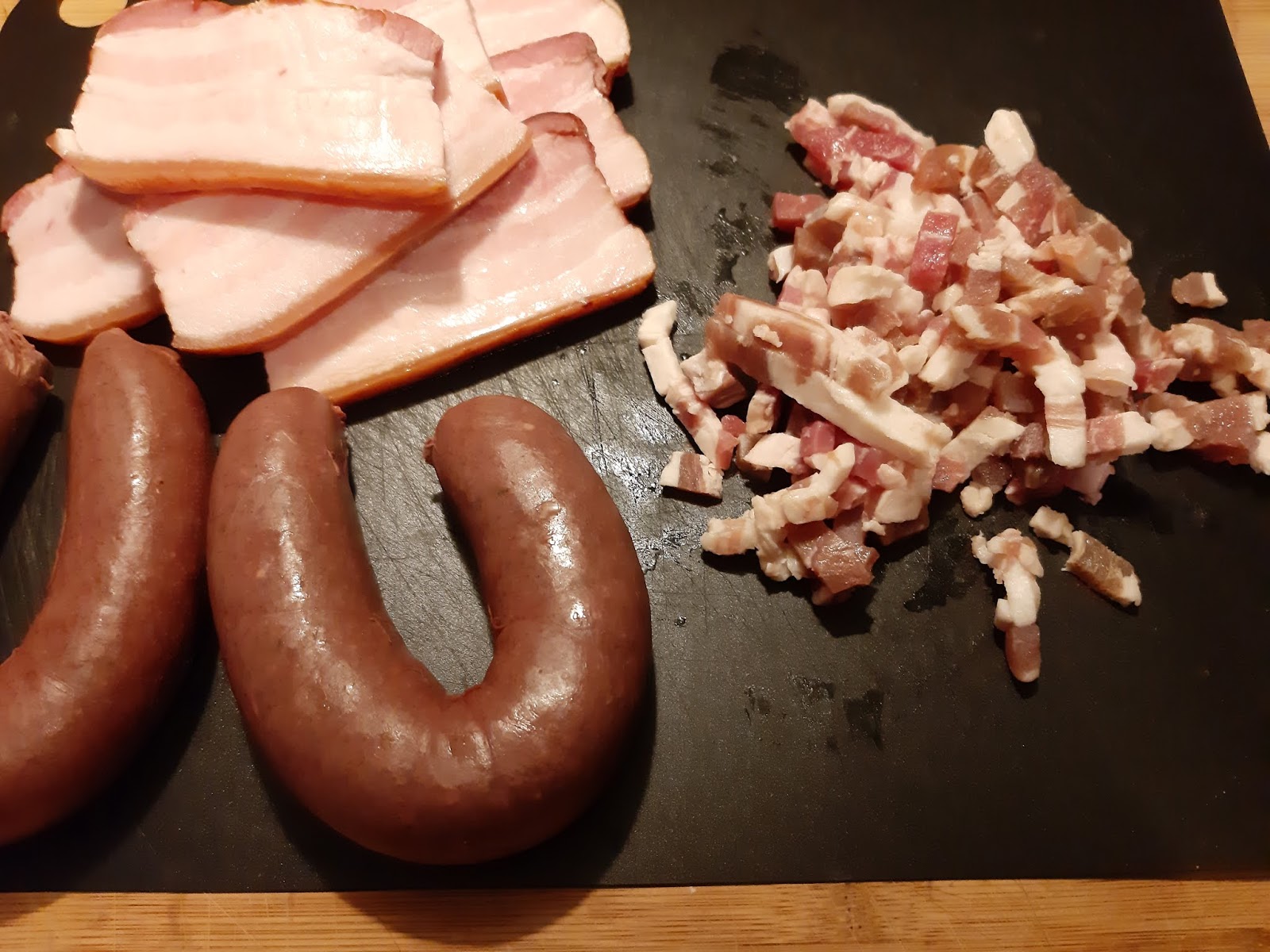 • Приготвям си месото от корема на малки филии, бекона на малки кубчета или лентички, а кървавицата оставям цяла, защото немската се разкашква при дълго готвене. Ако е българска или друга, можете да я нарежете на дебели парчета.