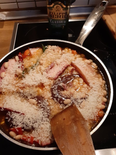 • Поръсвам върху ястието ориза и го натискам, за да потъне в бульона. Количеството течност не е 1:3 спрямо ориза, защото първо има още много продукти, а и като, че ли този ориз с тази пропорция не ми се сварява добре. Предпочитам течността да е малко повече.