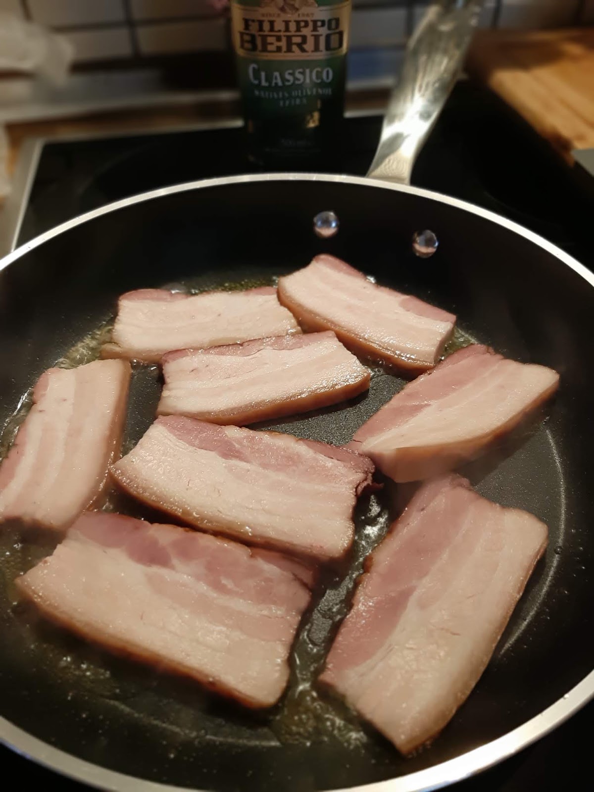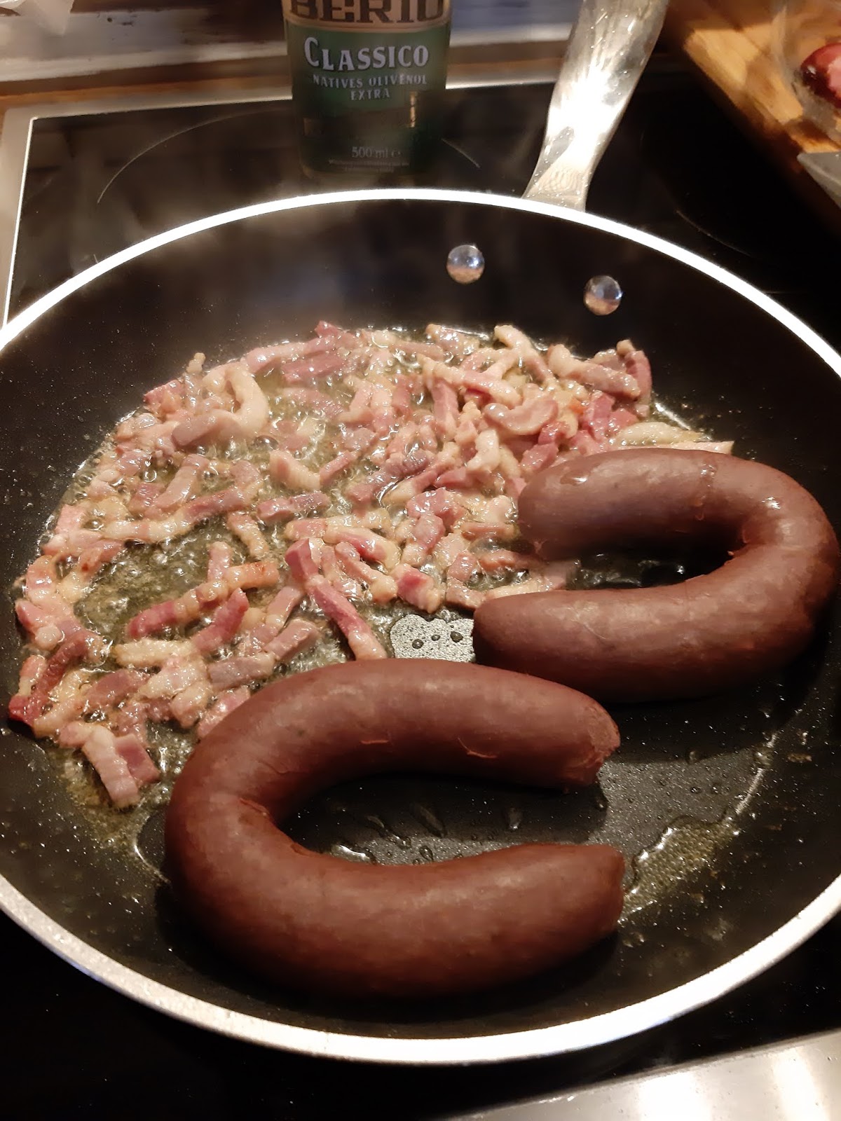 • Добавям останалия зехтин, намалява котлона и изпържвам кървавицата и бекона. Само за кратко или колкото да получат „захар“ от всички страни.