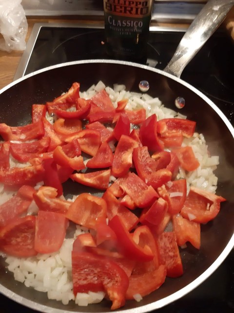 • В получилата се ароматна мазнина изпържвам до златисто ситно нарязания лук и нарязаната на едри парчета чушка.
