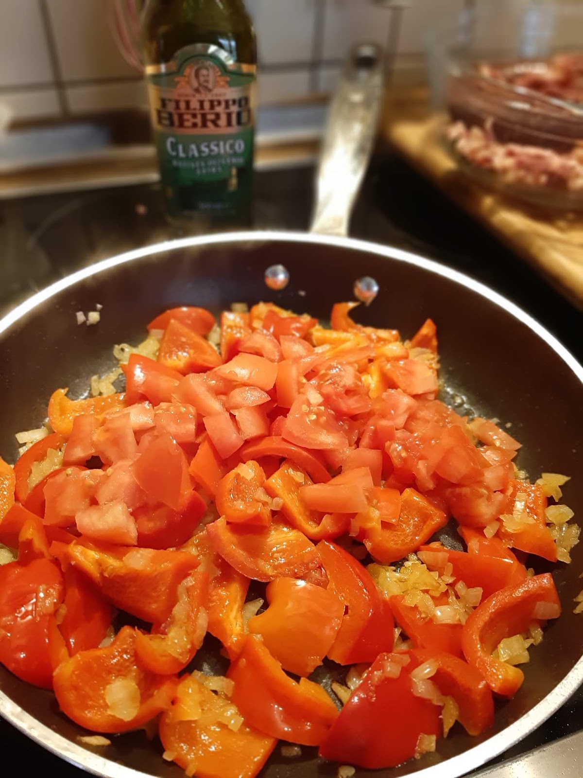 • След като зеленчуците омекнат, добавям домата и готвя докато и той омекне.