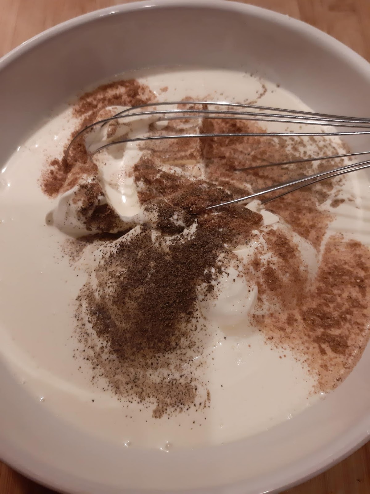 - В купа смесвам двете сметани и подправям с 1 ч. л. индийско орехче и черен пипер.