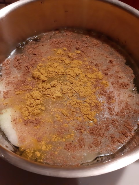 - Добавям към водата 1 ч. л. настъргано индийско орехче и 1 ч. л. къри