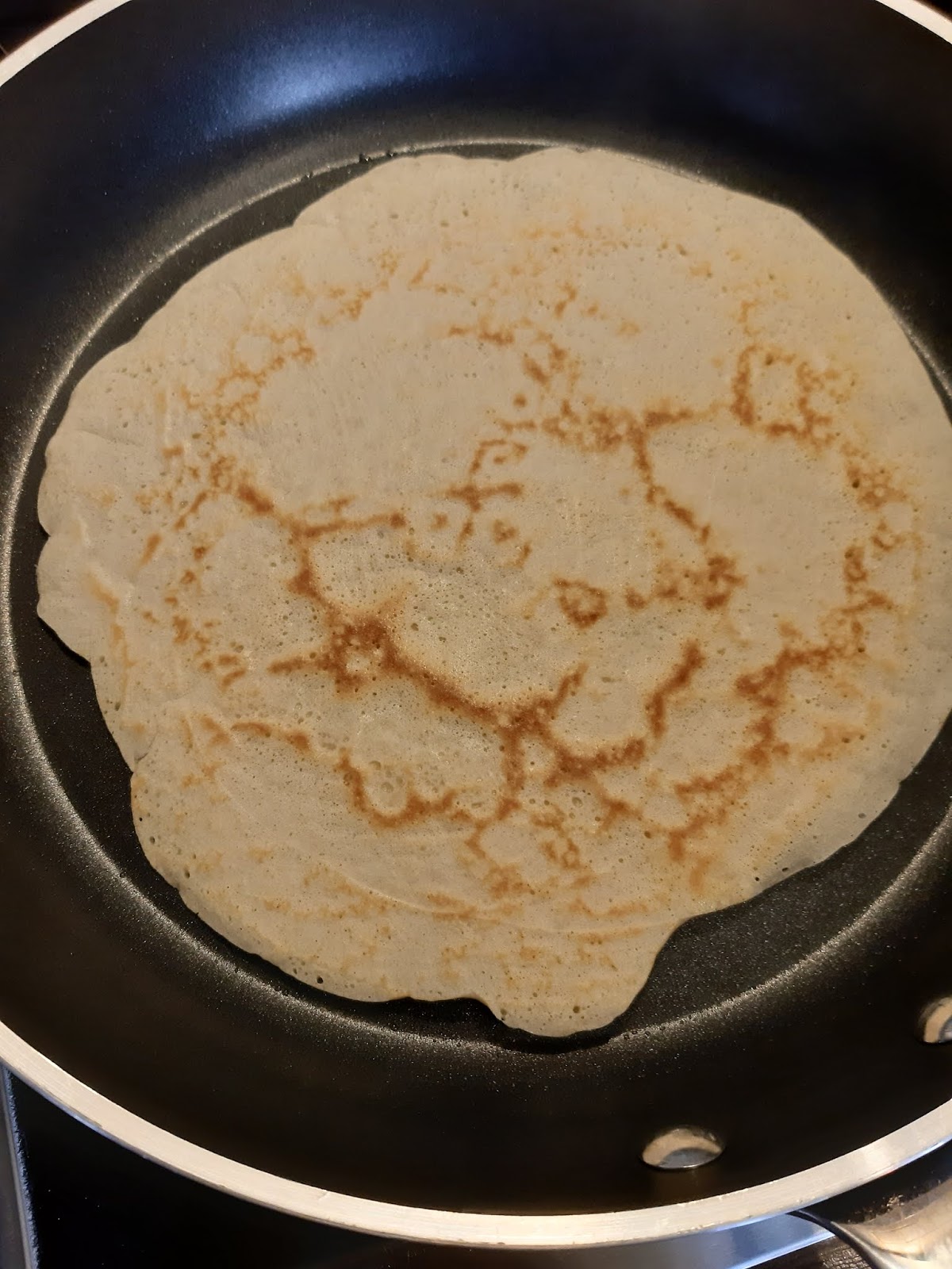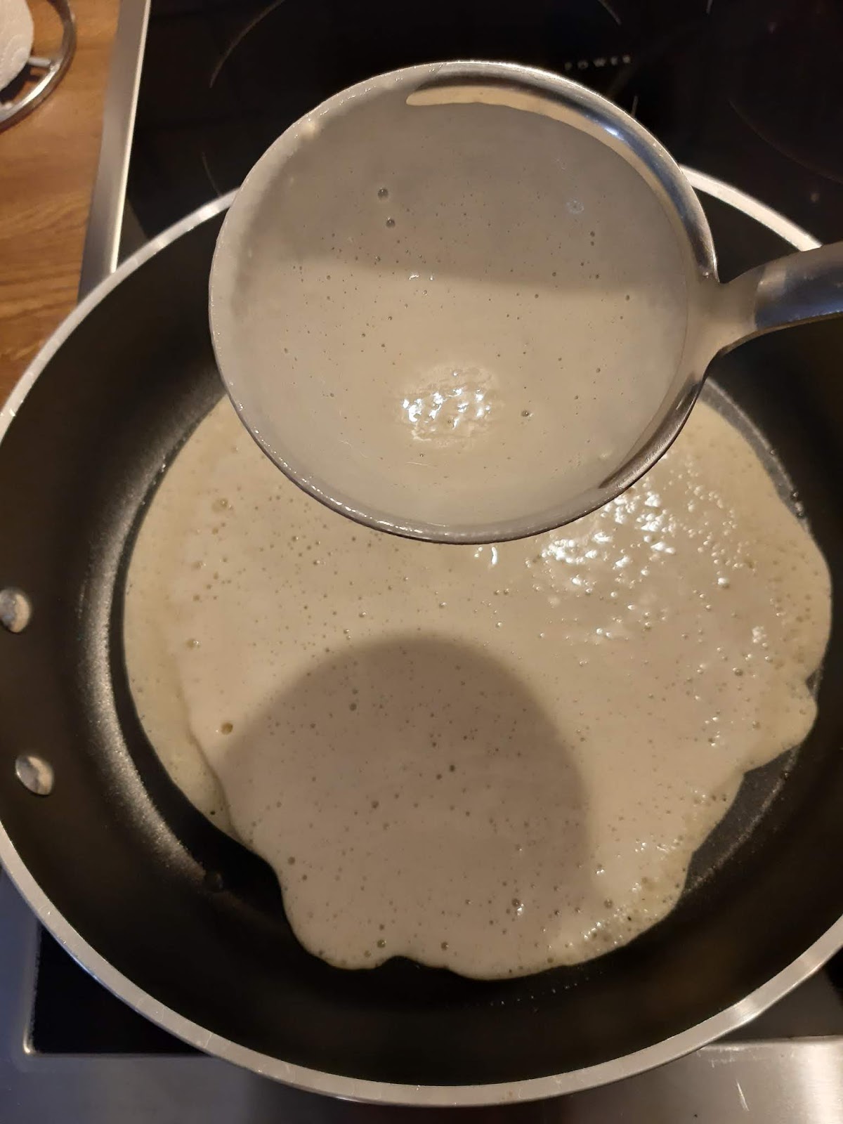 - Изсипвам един черпак от гъстата смес за БИДА и с накланяне на тигана разнасям по цялото му дъно.
