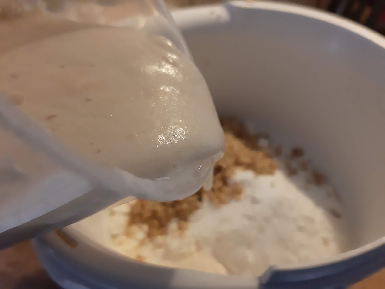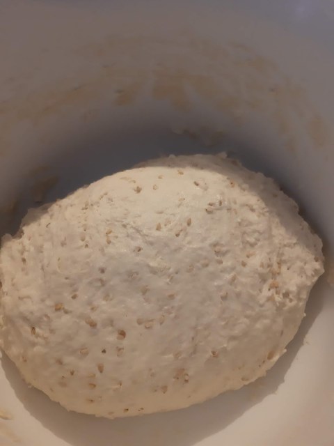 - В купата на миксера отмерих всички останали продукти, заедно със сусама и киселото мляко, стояло на стайна температура. Само с брашното внимавам. Винаги отмервам със 100 гр по-малко и после добавям. Никога не се знае колко точно брашно ще поеме. Може да е 400 гр. може да е 600 гр. Всичко зависи от типа брашно.