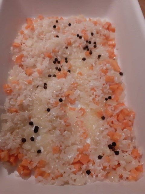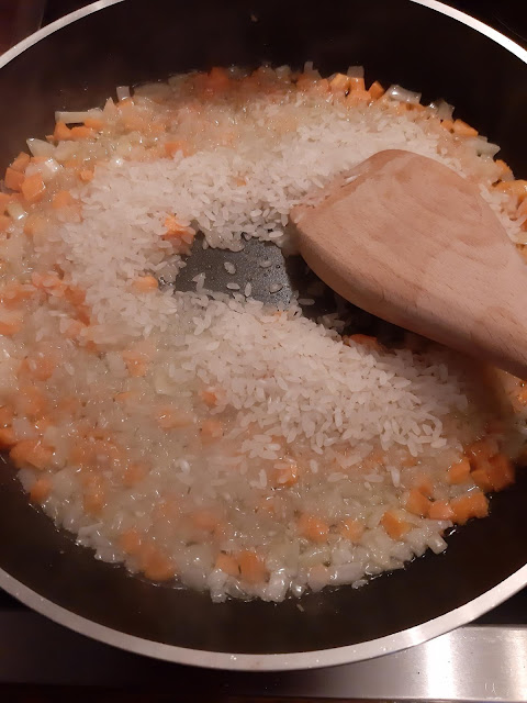 - Бъркам и пържа докато оризът стане прозрачен. Но не бива да се прекалява, защото има опасност оризът да не се свари после.