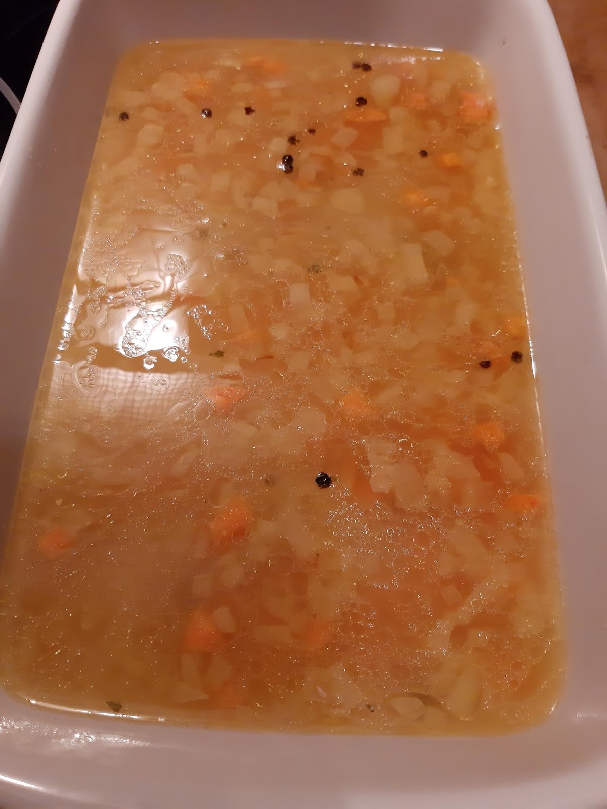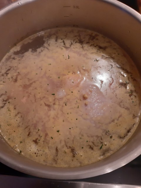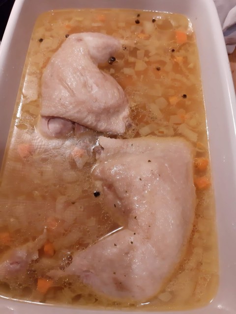- Почистих и измих добре пилешките бутчета, сложих на дъното на подходяща тенджера и залях със студена вода, колкото да ги покрие.