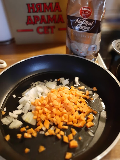 - Загрявам мазнината в тиган и задушавам ситно нарязаната глава лук и нарязания на малки кубчета морков.