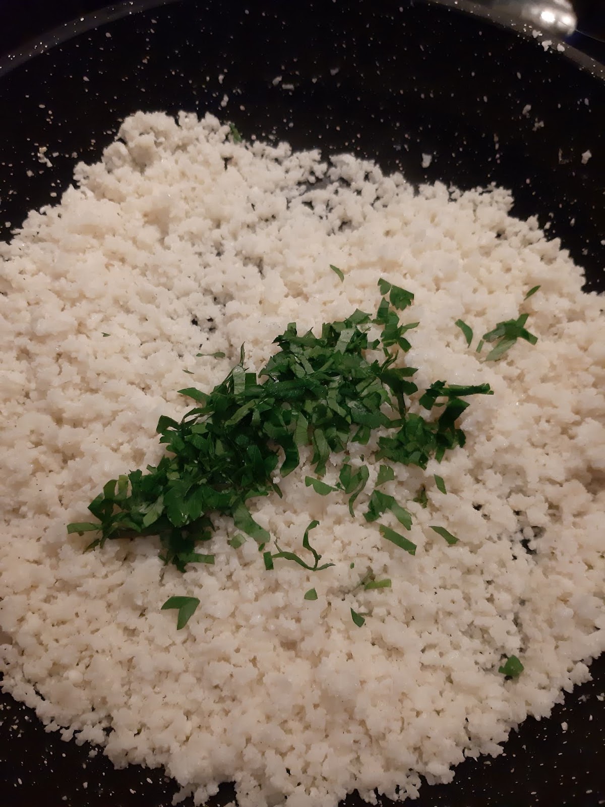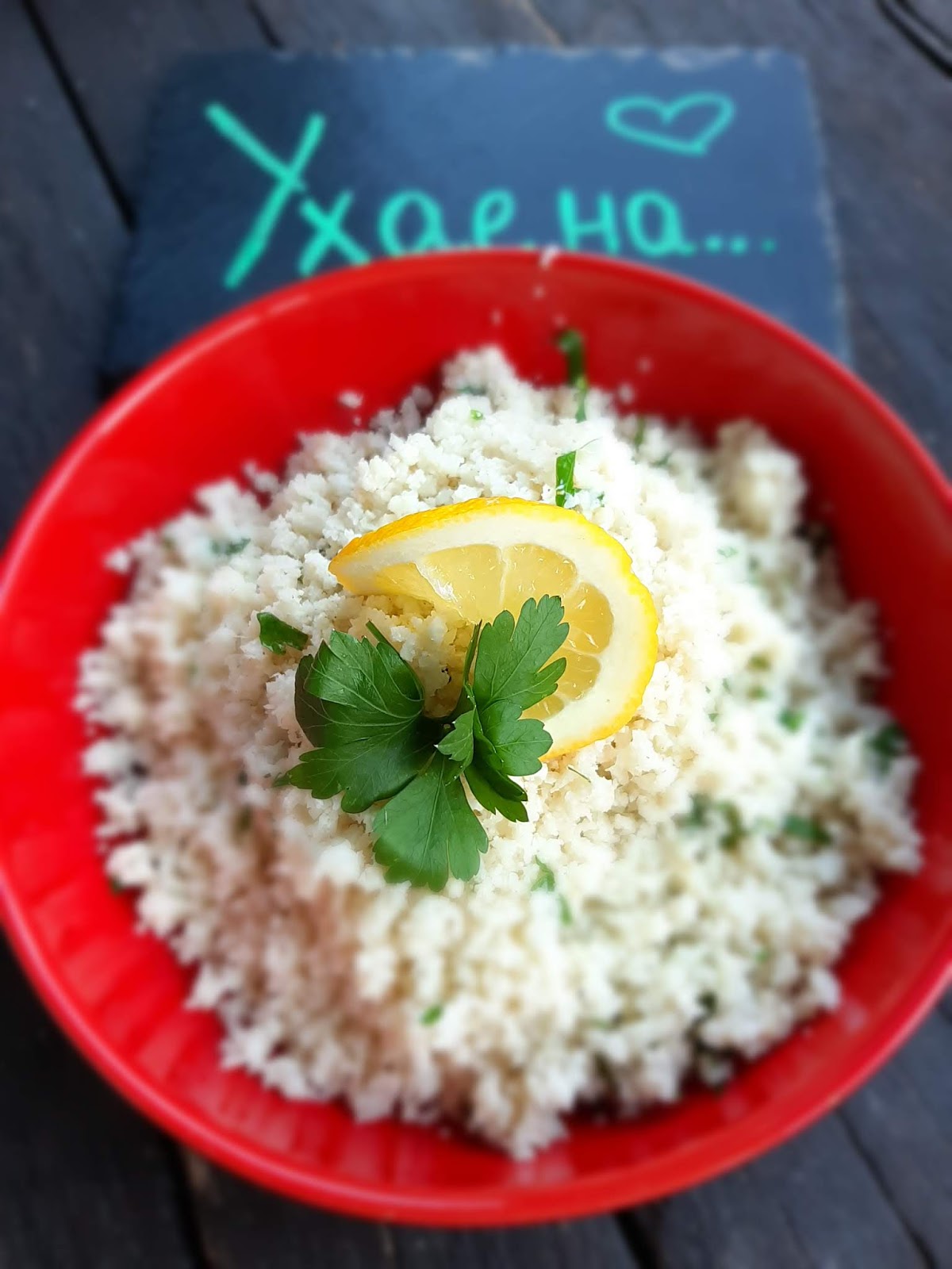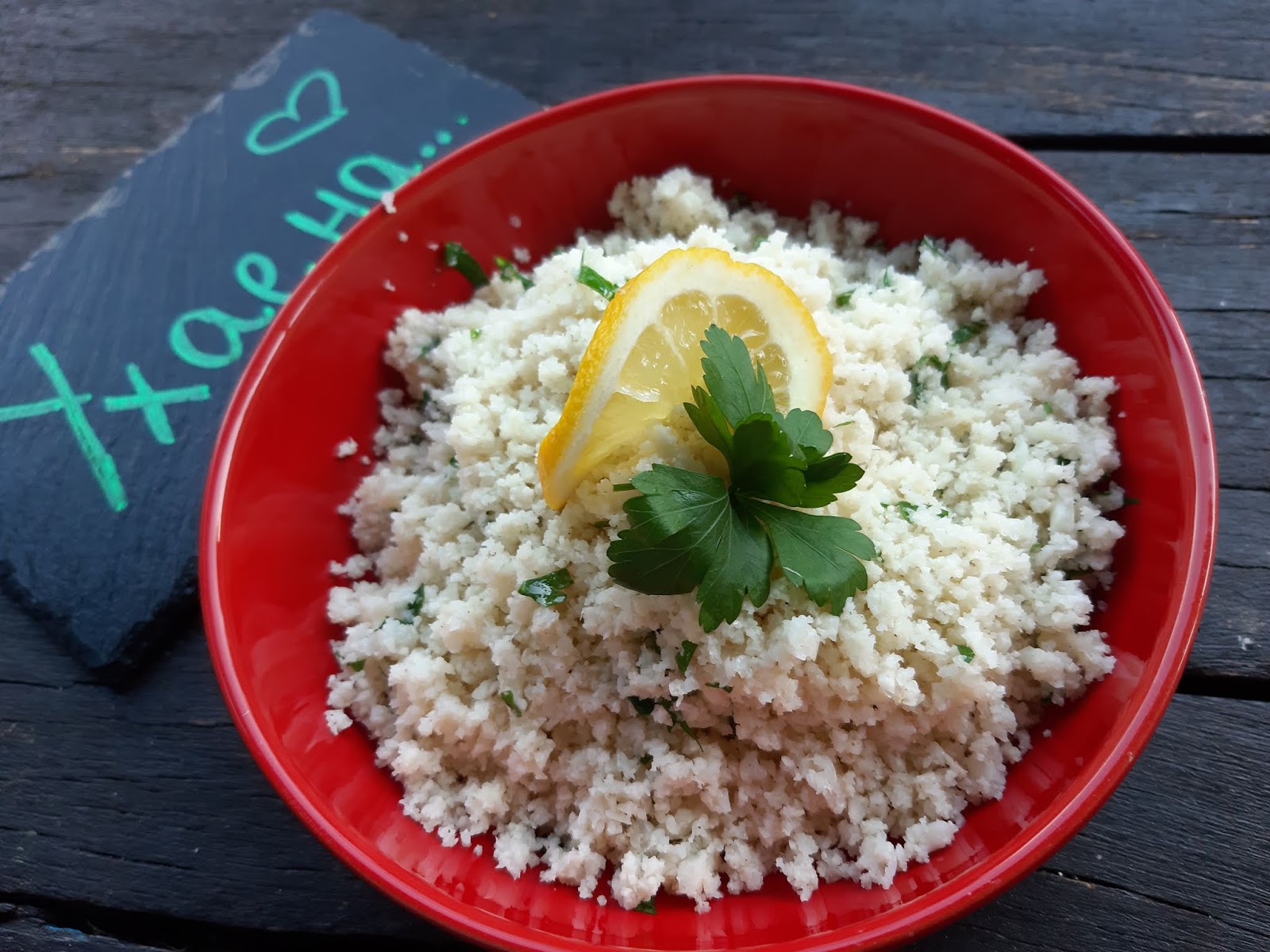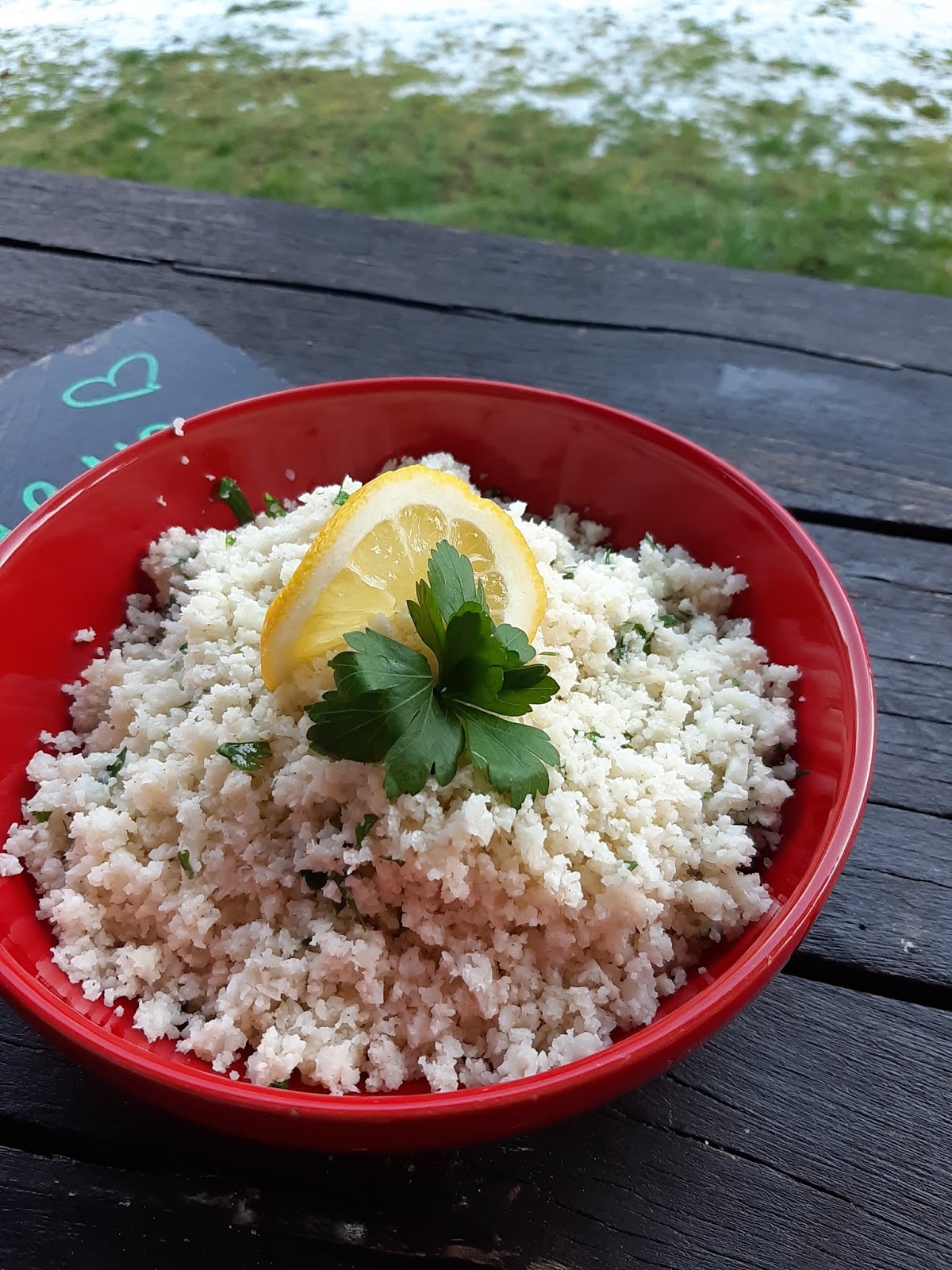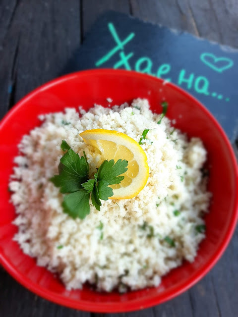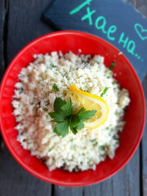 Днес сервирах този фалшив ориз като гарнитура за моята дива сьомга със сос от сметана и копър.