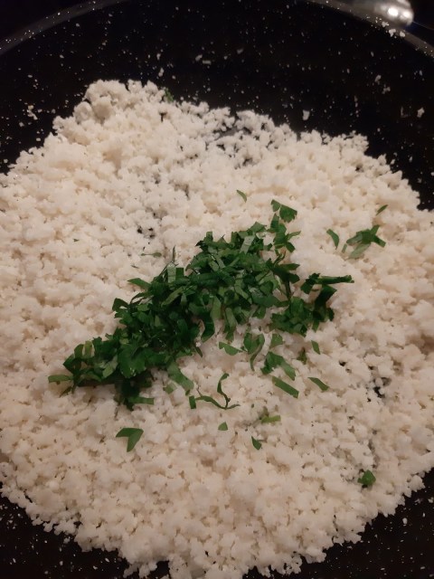 - Изсипвам фалшивия ориз при мазнината в горещия тиган, намалявам котлона на средна мощност и засичам 6 минути. От време на време разбърквам.