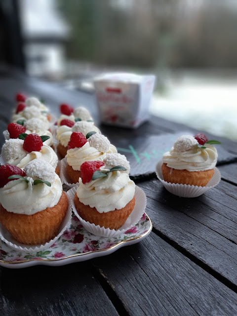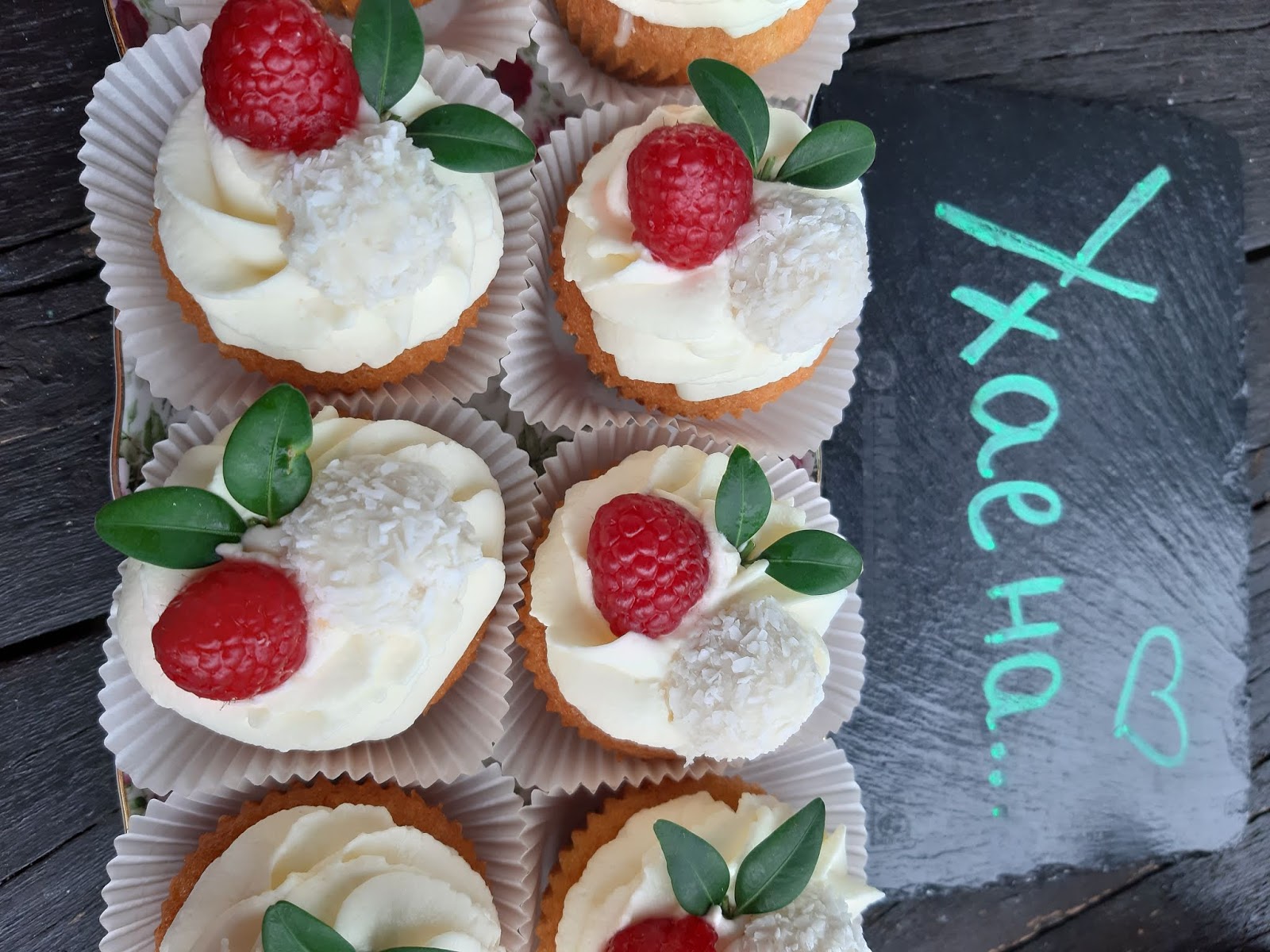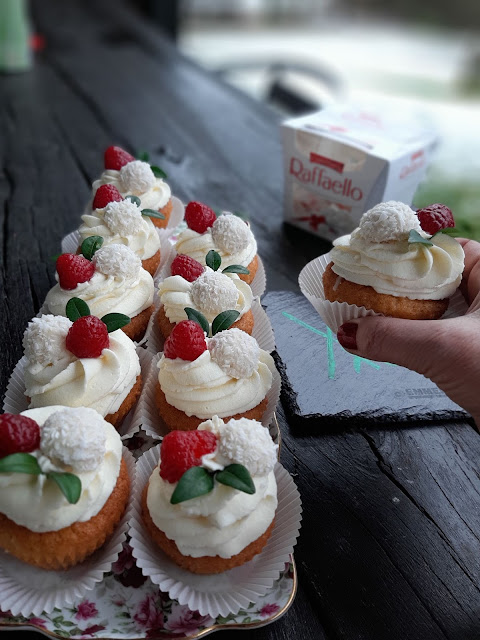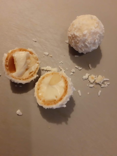 Комбинация от кокосови кексчета, пълнени с ганаш от бял шоколад, бадемче и покрити с вкусен крем от сметана и крема сирене. А декорацията е естествено от бонбони Рафаело, малинка и зеленчко. За съжаление нямах листа от мента и използвах листа от чимшир. Това си го припомних от старата рецепта за сладки ПРАСКОВКИ – ето тук.